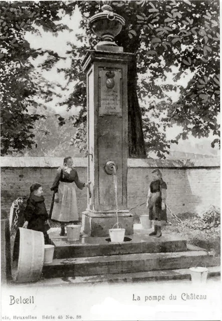 La pompe du château de Beloeil est une belle illustration du style néo-classique. Son corps, aux parois panneautées, repose sur une base de section carrée et est surmonté d’un grand vase à flamme en pierre polie.