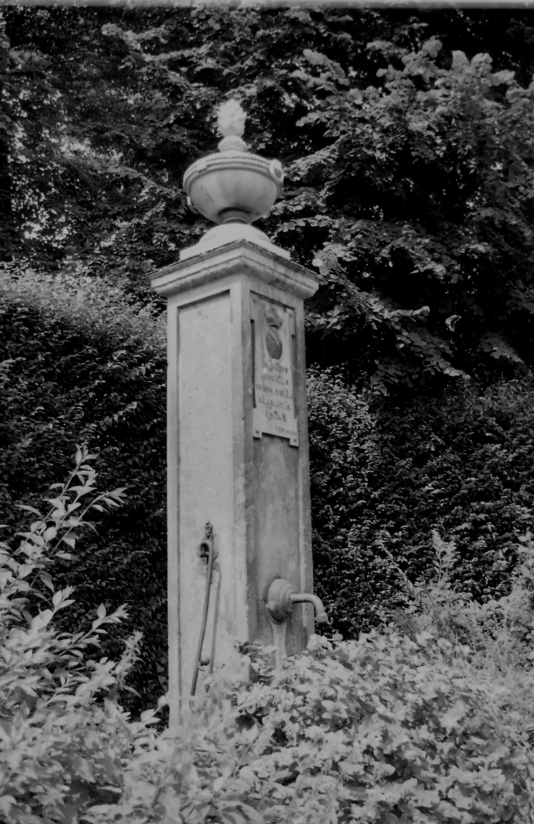 Au sommet du pilier, un cartouche porte l’inscription suivante : « Princeps Henricus Orlens Populo Elargitur Unsam XVIMA octobris ». Elle proclame que la pompe fut offerte au peuple à l’occasion de la naissance du prince Henri de Ligne le 16 octobre 1824.