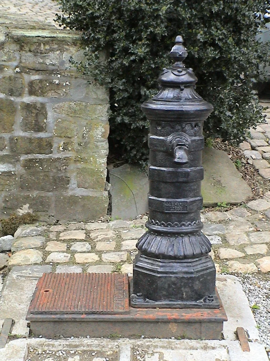 Cette double pompe à eau en pierre bleue fut construite par De Lateur en 1777, selon l’inscription.