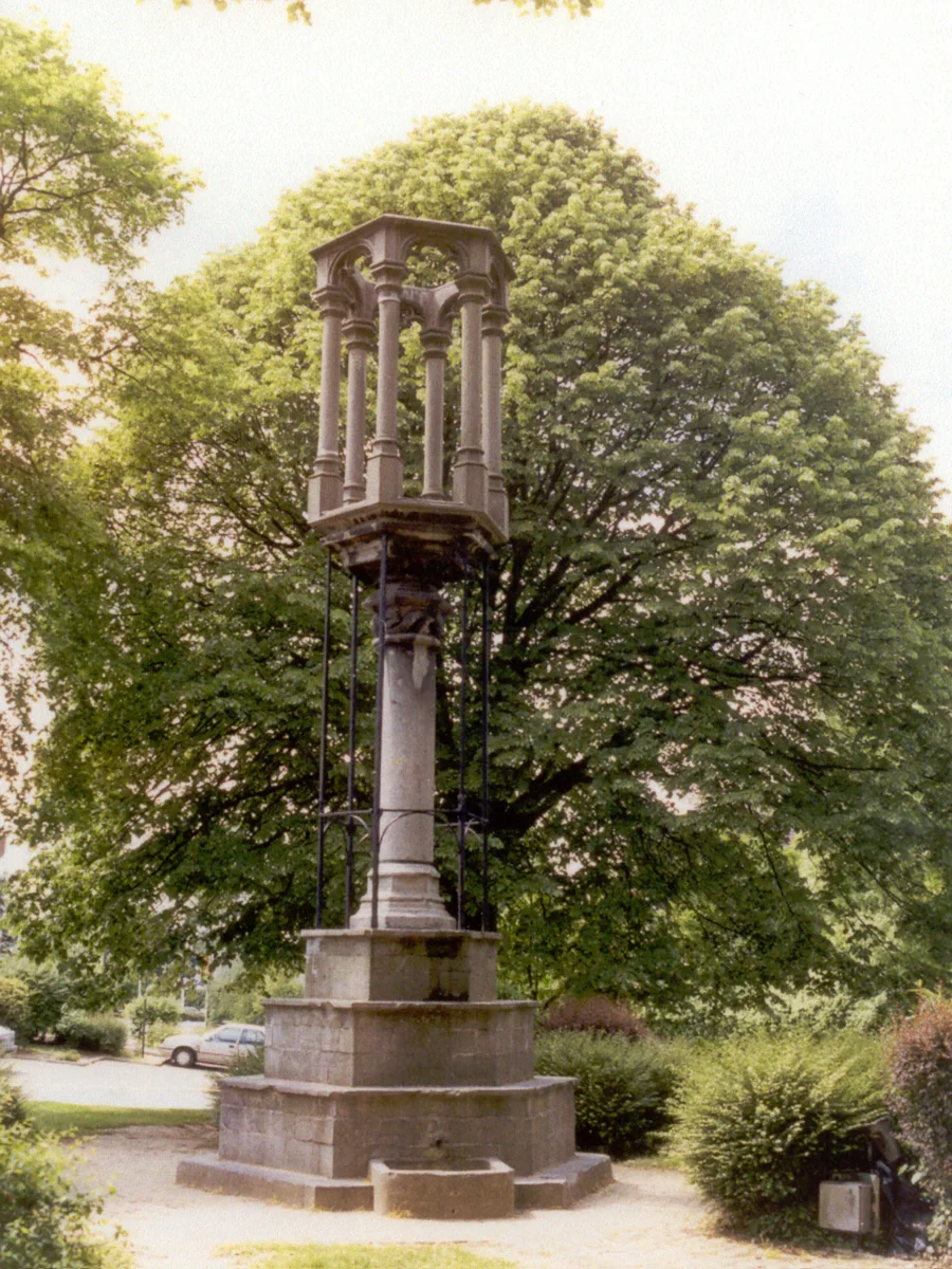 Les deux bacs en pierre attenant à la base furent installés en 1847 suite à une restauration. Une pompe, aujourd’hui disparue, fut installée également à la base du pilori. Cette base se compose d’un socle hexagonal à quatre niveaux où est posée la base moulurée qui supporte la colonne à fût lisse.
