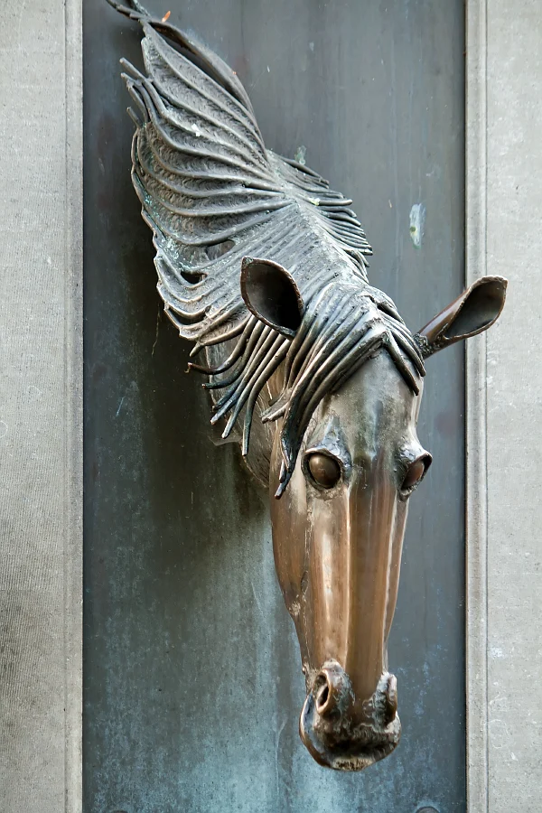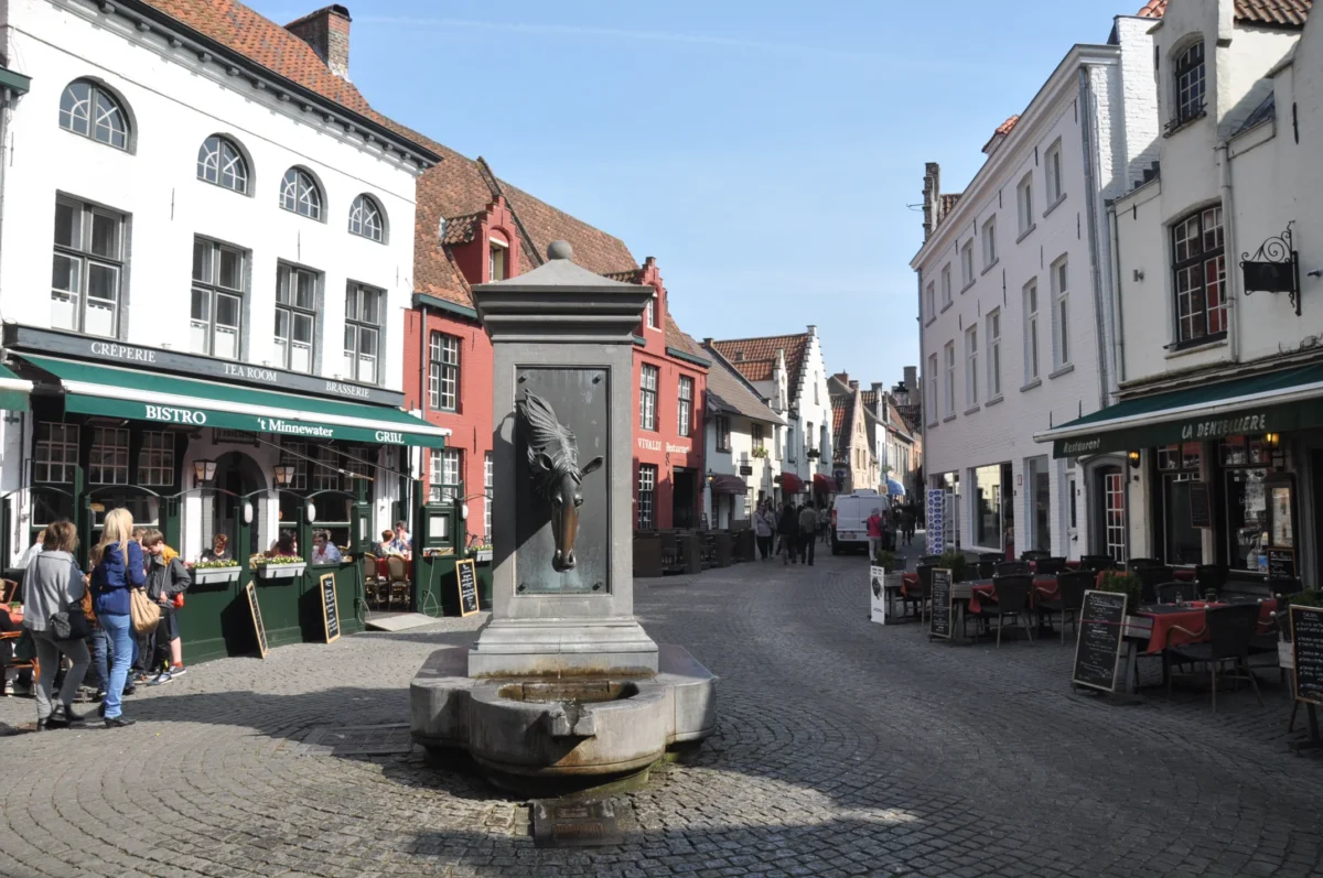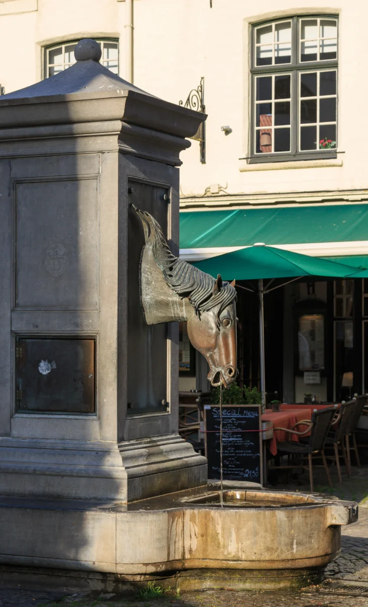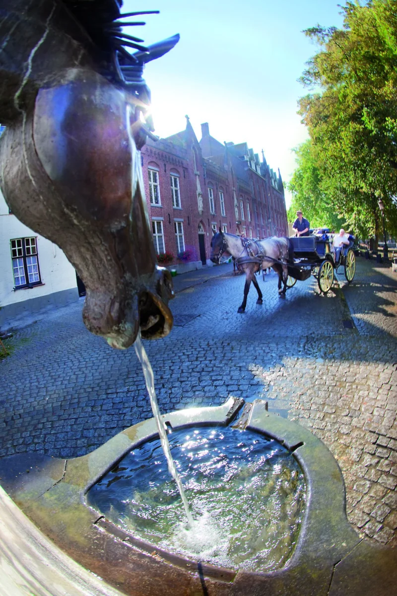 On ne peut pas se tromper sur l’indice donnés par les deux têtes de cheval qui orne chaque côté de la fontaine: il s’agit en effet d’un abreuvoir à destination des chevaux des calèches qui promènent les touristes dans les rues de Bruges.