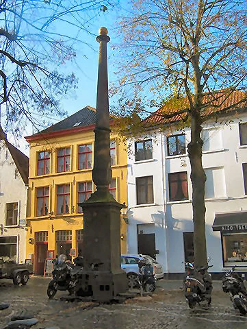 Le socle, classique quant à la mouluration, est anormalement élevé en proportion de sa largeur. Il est surmonté d’une sorte d’immense balustre qui semble vouloir dépasser le faîte des maisons.