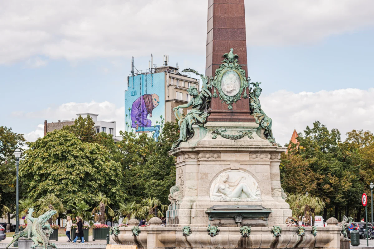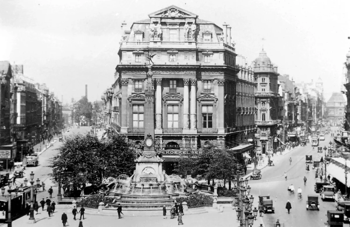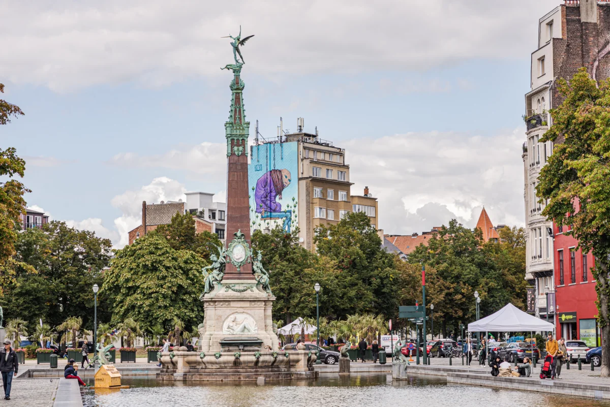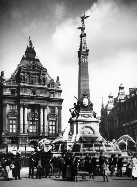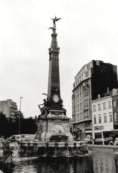Dessinée par l’architecte E. Janlet, décorée par les statuaires G. Devresse et J. Dillens, la Fontaine Anspach est toute hérissée de monstres fantastiques qui crachent l’eau en tordant leurs échines et manifestent – comme l’écrit Charles Bernard – une allégresse qui effraie les naturalistes. La décoration ornementale est de Georges Houtstont.