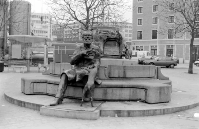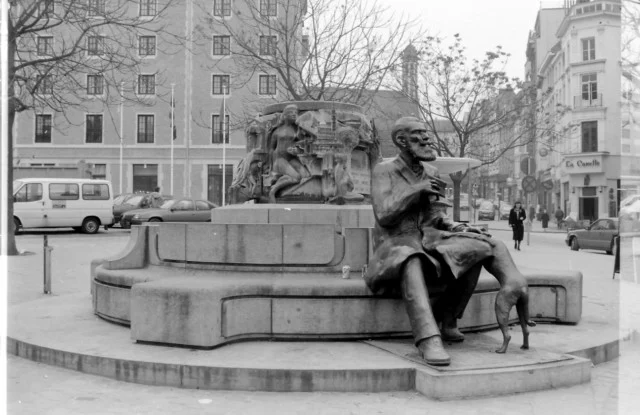 La fontaine représente un homme, livre à la main, qui se repose sur le bord d’une fontaine tandis qu’un chien joue à mordiller sa manchette gauche. Cet homme, c’est Charles Buls, orfèvre dans cette rue du Marché aux Herbes, tout comme l’était son père. Il s’impliqua en politique et fut bourgmestre de la Ville de Bruxelles de 1881 à 1899.