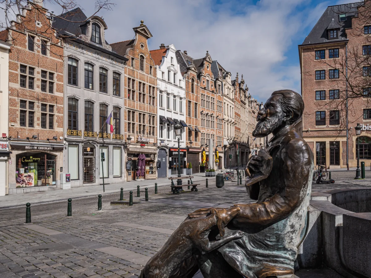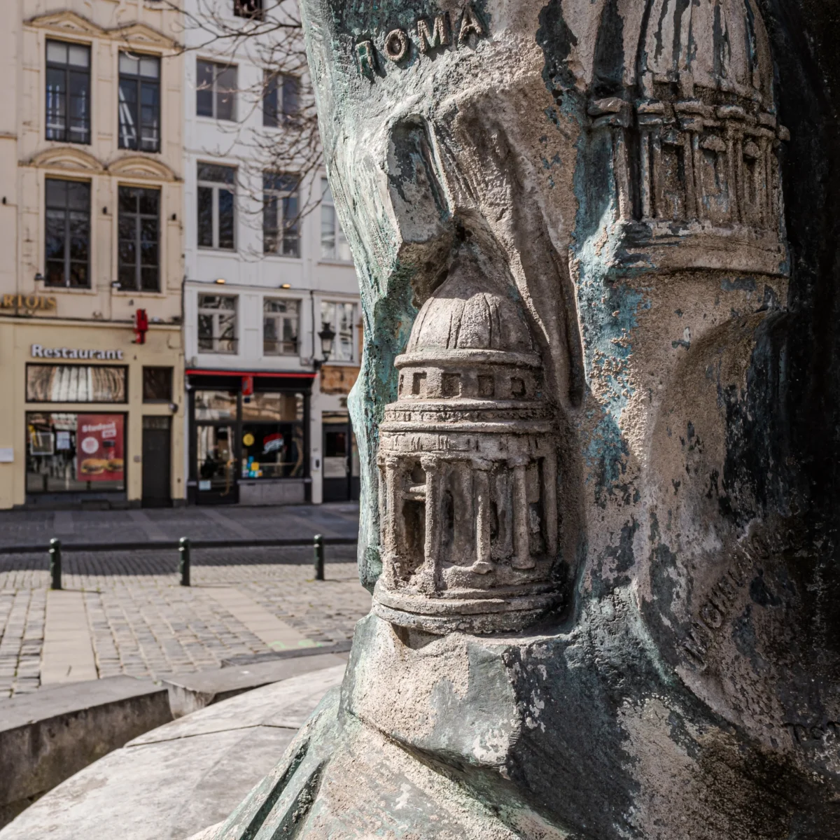 La frise en bronze qui couronne la fontaine énumère quelques étapes de ses voyages en Italie et en Grèce, compléments à sa formation artistique. Sous son maïorat, la ville entreprit la restauration de son patrimoine comme le soulignent les sculptures de l’hôtel de ville et de la porte de Hal sur la frise de la fontaine. Le bassin de la fontaine est du type « agora ».