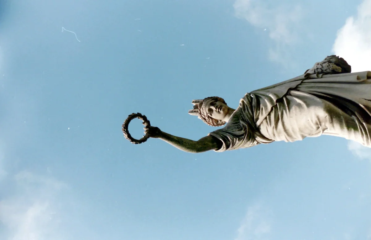 Son bras tendu décerne une couronne de laurier. Elle domine une vasque de bronze posée comme une coupe peu profonde sur un socle élégant circulaire qui lui sert de pied. L’eau de la vasque supérieure qui arrive par quatre gueules de lions ailés retombe dans la vasque inférieure par douze têtes de lion sculptées dans la bordure de la vasque supérieure.