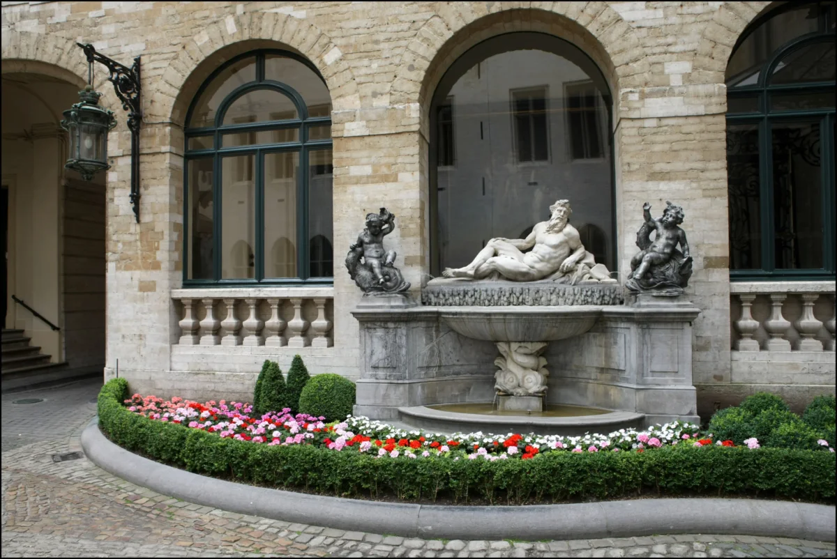 Le vieillard de gauche, accoudé sur une urne symbolisant la source du fleuve, représente la Meuse et celui de droite symbolise l’Escaut. À la base des fontaines, une deuxième vasque reçoit l’eau du réservoir supérieur par la gueule des deux dauphins entrelacés.
