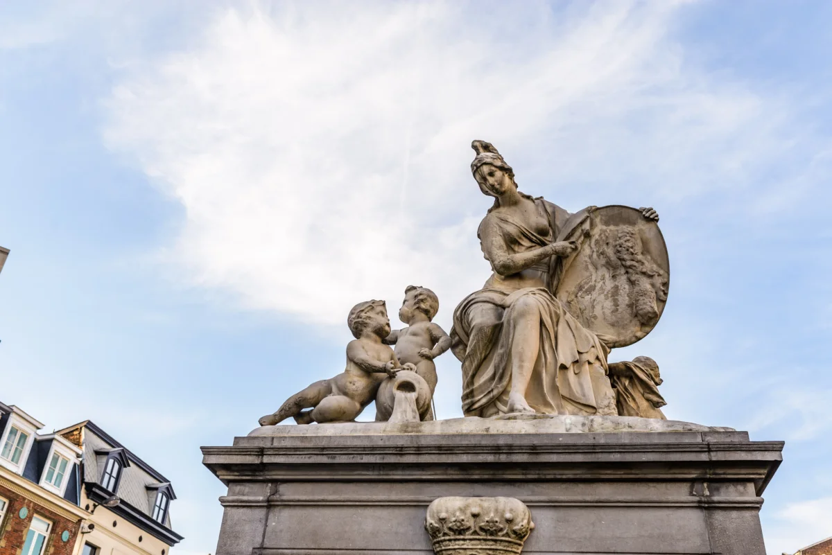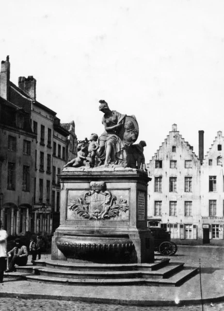 Érigée en 1661 à la demande de Lord Bruce, comte d’Ailesbury, Pair d’Angleterre, et ce en témoignage de gratitude pour l’hospitalité reçue, la Minerve du grand sablon à Bruxelles est l’œuvre du sculpteur Jacques Bergé (1693-1756). Le groupe qui surmonte la fontaine ne fut placé qu’en 1751 et représente la Minerve assise tenant un médaillon aux effigies de