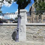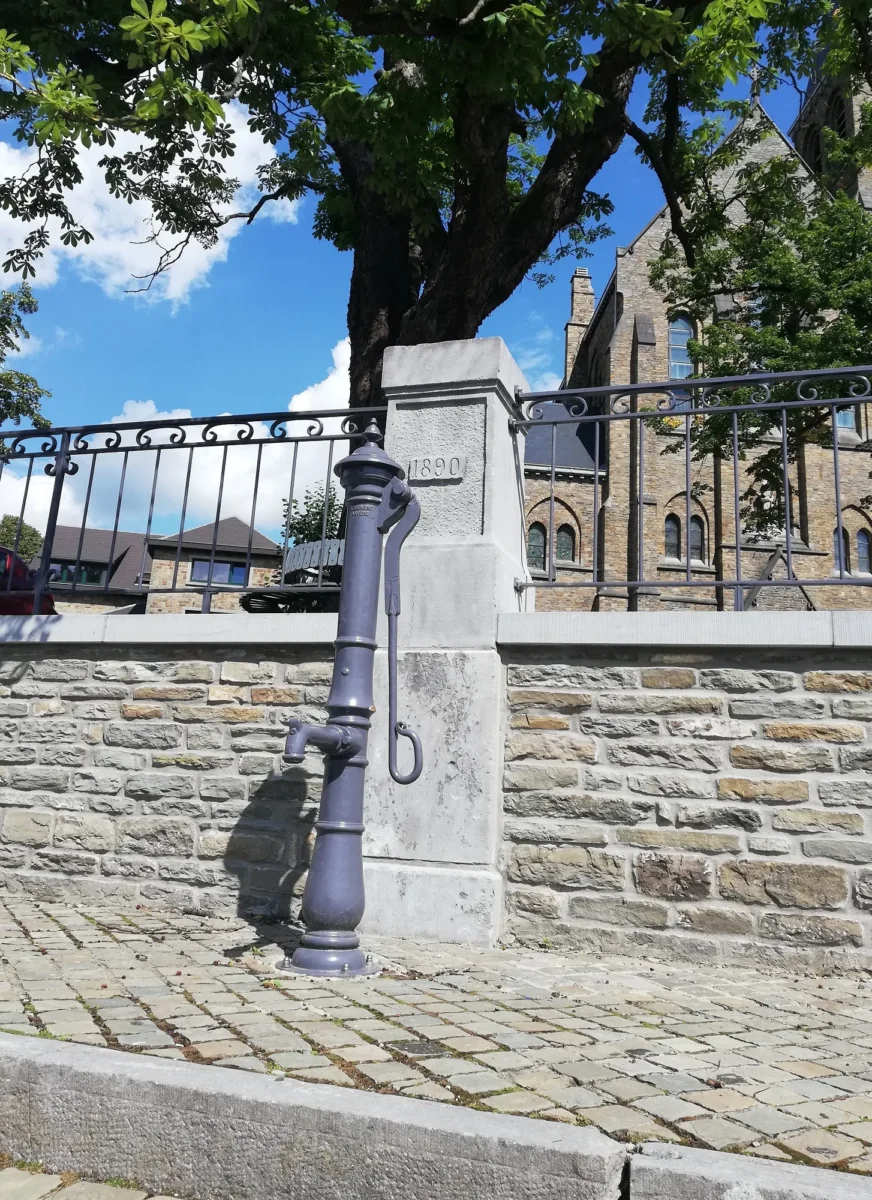 Cette double pompe à eau en pierre bleue fut construite par De Lateur en 1777, selon l’inscription.