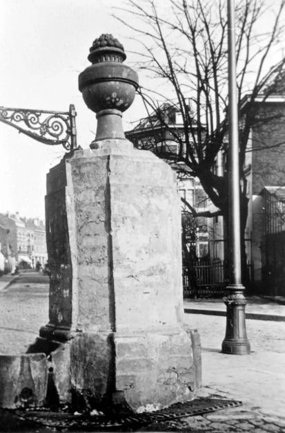 Très dénaturée quant à son caractère ancien, cette fontaine ne constitue plus à ce jour qu’un vestige de ce qu’elle devait être jadis. Elle est composée d’un socle assez puissant, quadrangulaire, à pans coupés, surmonté d’un vase de pierre de style Louis XVI, qui en constitue le seul ornement. Une forte plinthe moulurée la souligne. Le parement détruit à été remplacé par une couche de ciment avec joint et aujourd’hui par un parement de pierre.