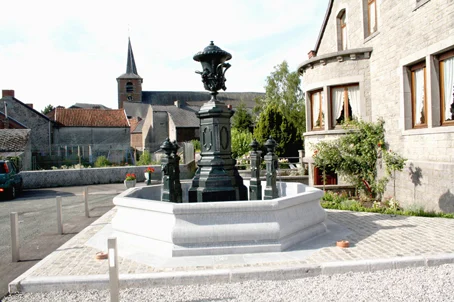 Après avoir été témoin des joies et des peines des villageois pendant 80 ans, le changement des conditions de vie a fini par la rendre inutile et gênante et les autorités de l’époque ont décidé sa démolition. Rendre au village sa fontaine était un objectif essentiel de l’ASBL « Les Sentiers du Fer », car celle-ci était l’une des valeurs les plus précieuses du patrimoine de Fraire. Les pièces en fonte de l’ancienne fontaine étant récupérées, grâce au geste généreux de leur propriétaire, l’ASBL pouvait mettre son projet à exécution. La reconstruction, à l’identique, en bordure de la place, a débuté en 2008. La mise en service des jets d’eau a eu lieu en septembre 2011. Son socle ouvragé avec sa vasque de couronnement en font une fontaine unique dans la région. Le projet a été réalisé avec le soutien de la Fondation Roi Baudouin et de la Loterie Nationale. De nombreux Frairois et