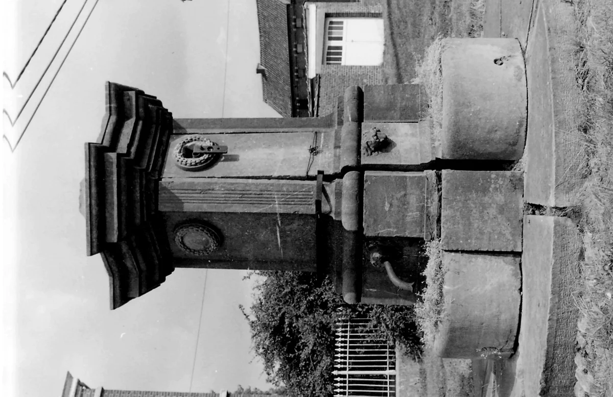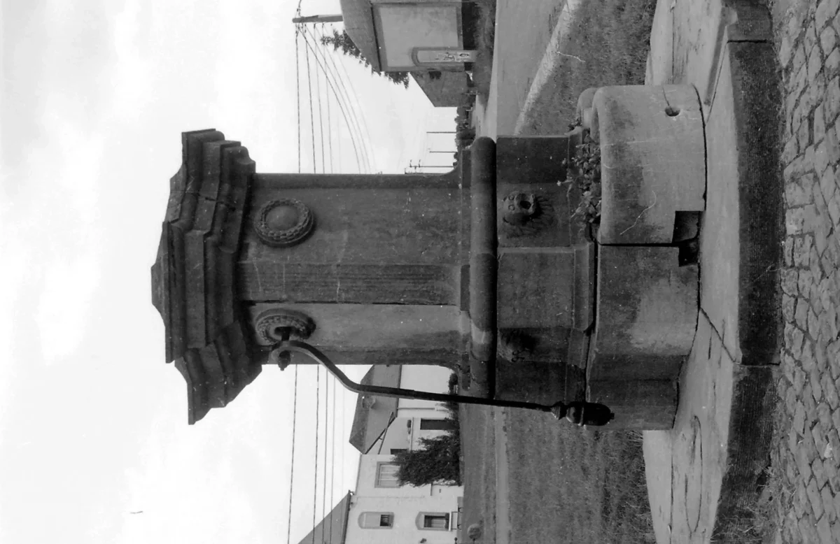 Bien campées à chacune des extrémités de la place, ces deux grandes pompes identiques sont composées d’un pilier cruciforme qui supporte un lourd entablement.
