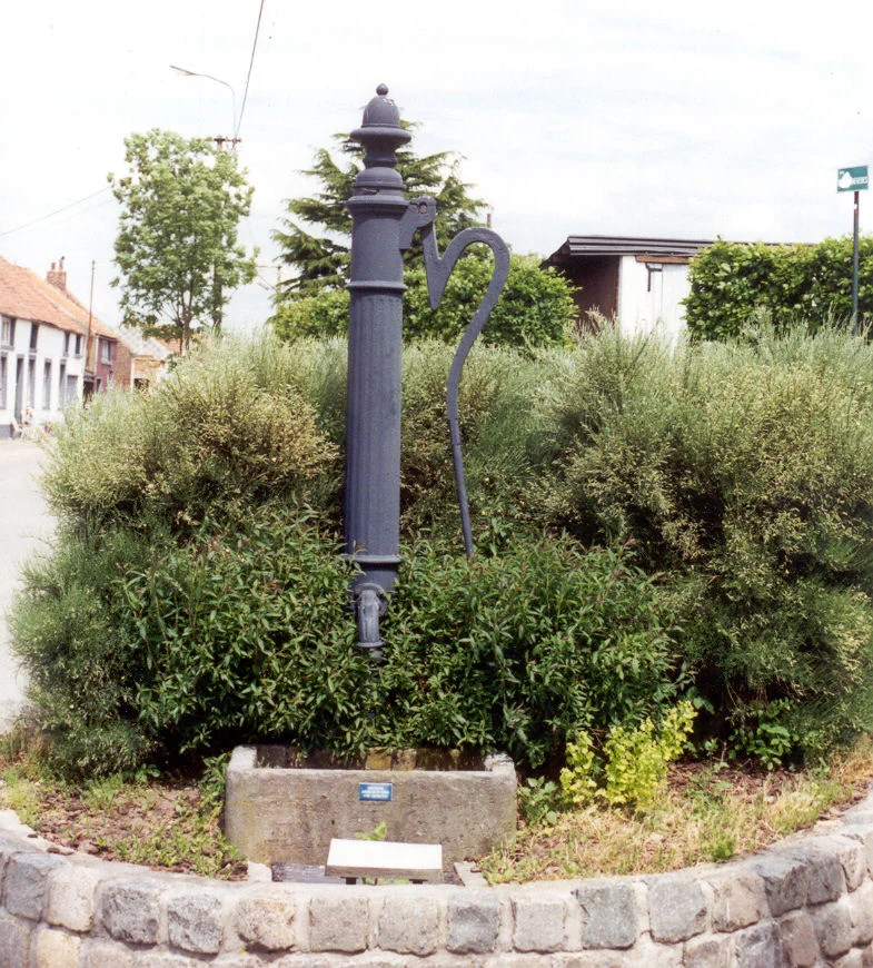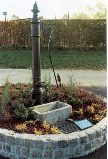 La pompe se trouve dans un parterre de fleurs circulaire réalisé avec des pavés. Le tout a été revalorisé lors de l’Année des fontaines en 1990. Le bras dessine une belle arabesque avec retour, amenant ainsi le pommeau à hauteur de bras.