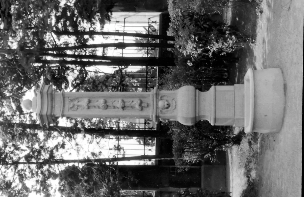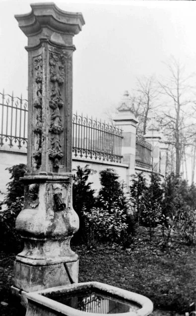 C’est en 1688 que le curé Henin fit installer la fontaine à l’entrée du cimetière de Laeken. Composée d’une colonne de pierre bleue sur plan carré dont les quatre faces sont incurvées vers l’intérieur. Le soubassement, grassement mouluré dans l’esprit du style baroque, est décoré sur chacune des faces par une tête de chérubin. Les faces de la colonne, formant panneaux, sont garnies de chutes de feuillages et de fruit d’une facture assez massive mais vigoureuse. Une pierre de couronnement, sur le même plan que la colonne et que contourne un profit de chapiteau toscan, la surmonte. L’eau s’écoulait dans un bassin semi-circulaire prolongé en longueur.