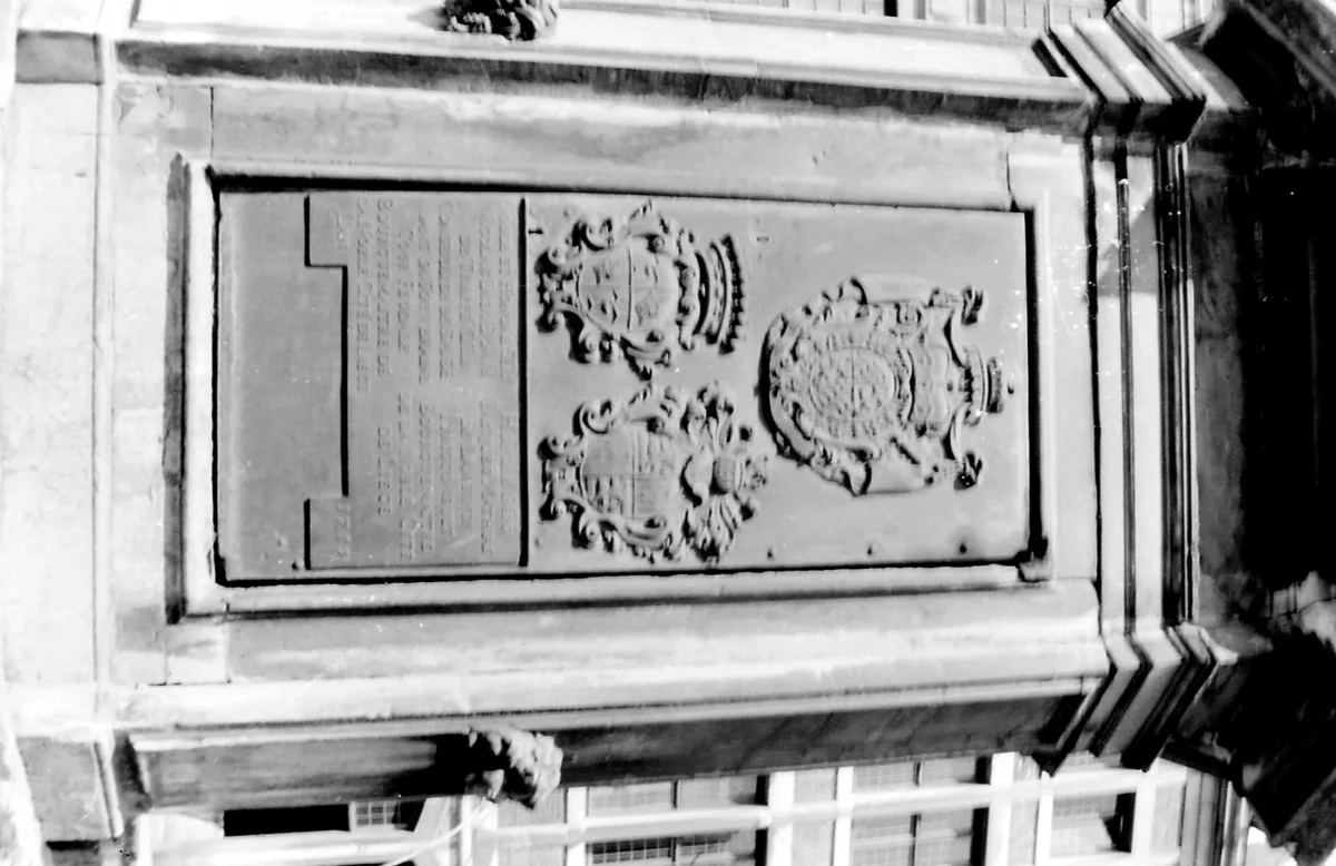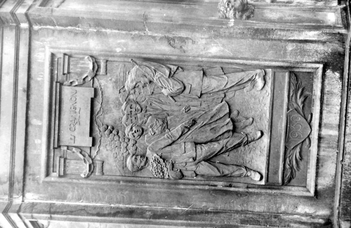 L’ensemble s’achève par un couronnement mouluré, à nouveau orné de blasons et surmonté de la pomme de pin.