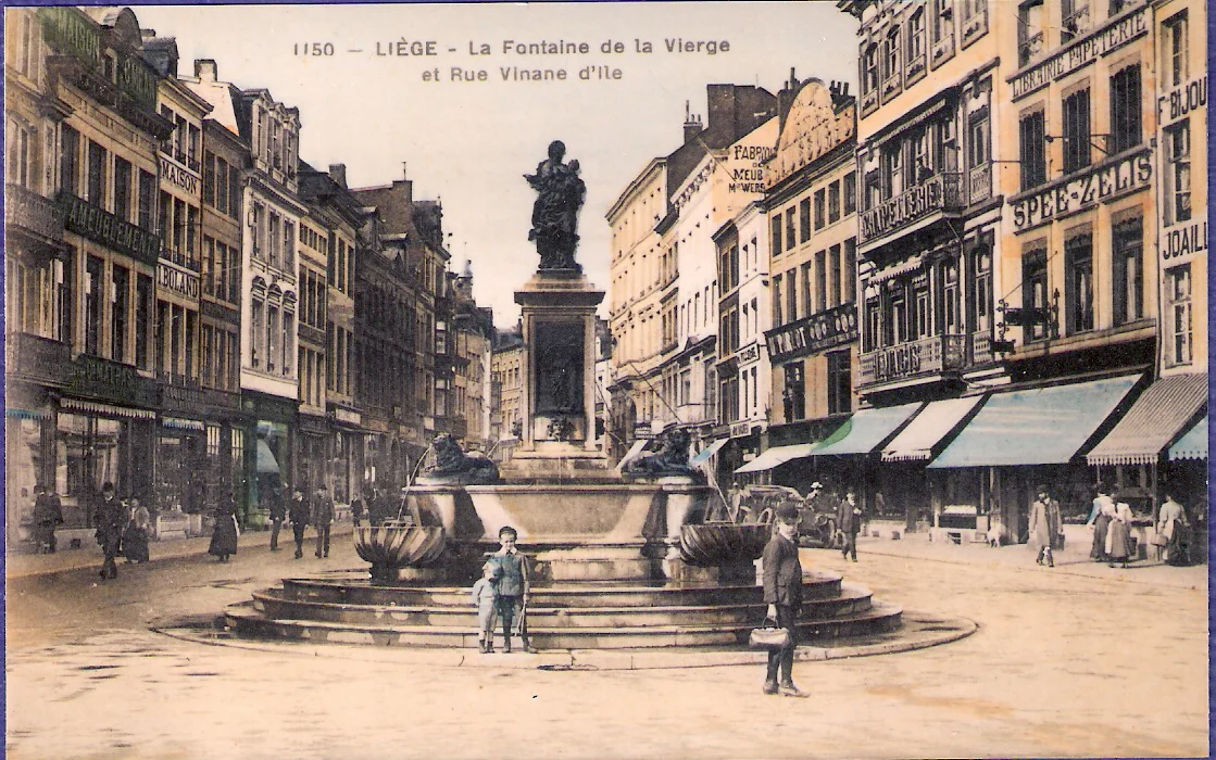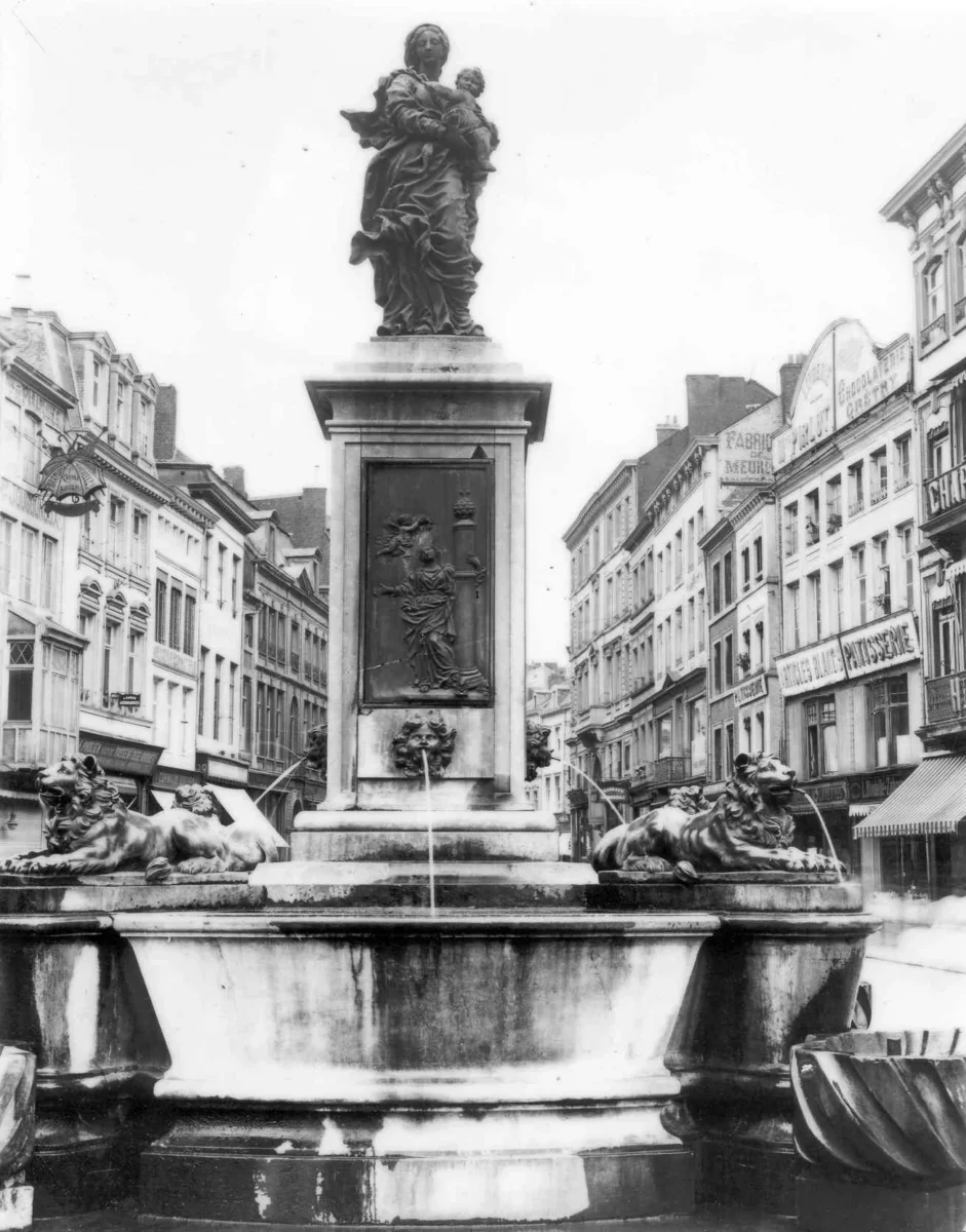 Au centre d’un vaste emmanchement circulaire, un pilier s’élève vers les cieux portant une statue de la Vierge et de l’Enfant. Au pied de chacune de ses faces, gît un grand bassin rectangulaire dans lequel une tête de putto crache son eau. A chacun de ces bassins, un lion couché dirige à son tour son jet d’eau, vers une vasque en forme de coquille. La face antérieure du pilier est ornée d’un bas-relief représentant la ville de Liège, couronnée par un angelot et flanquée du perron liégeois.
