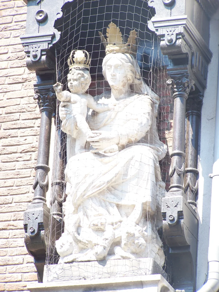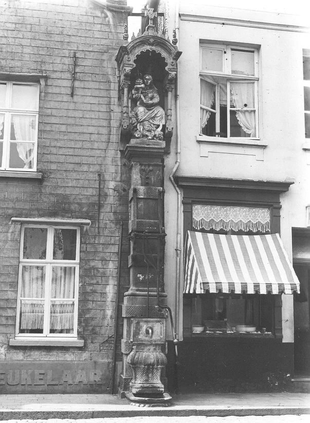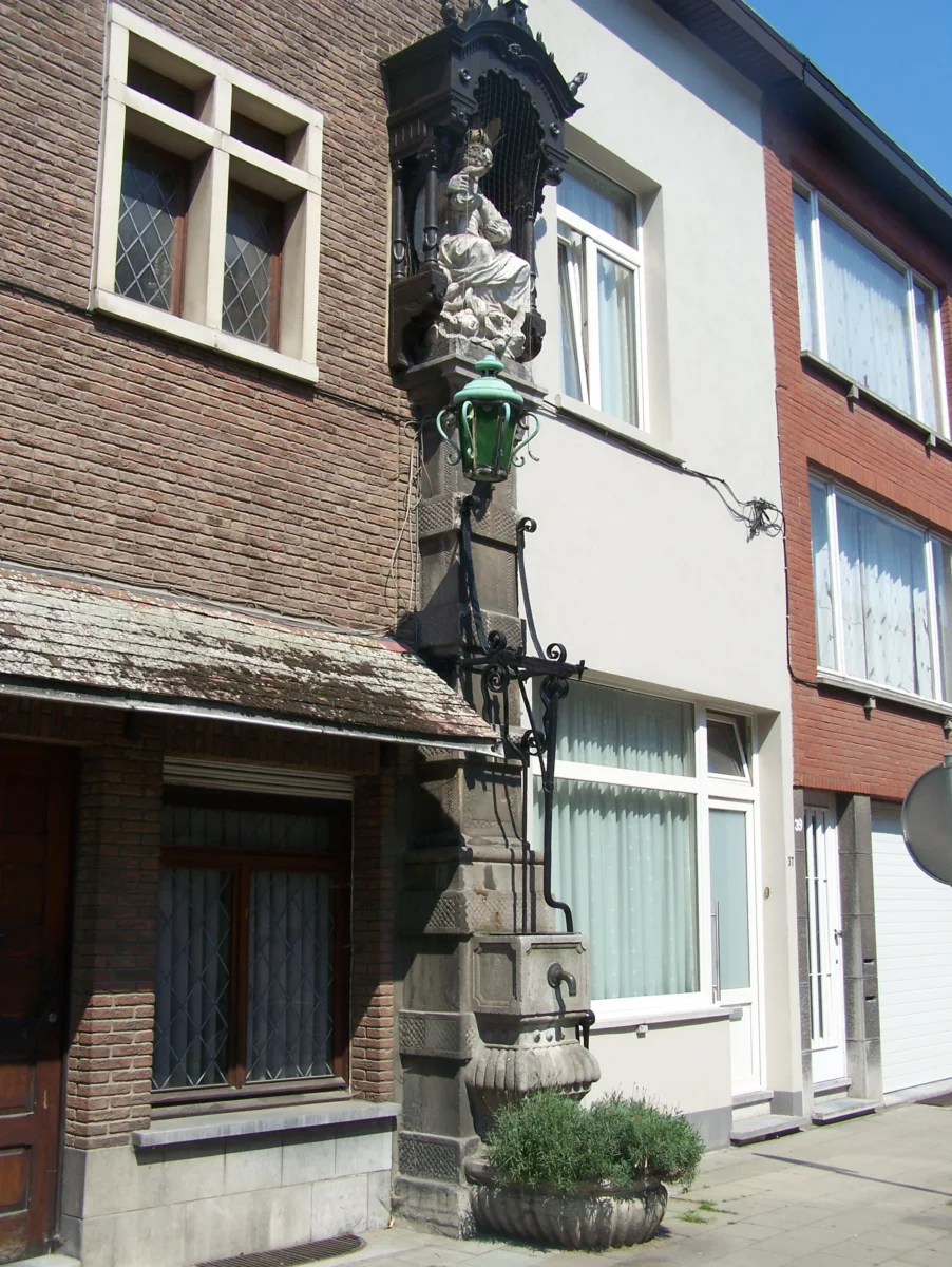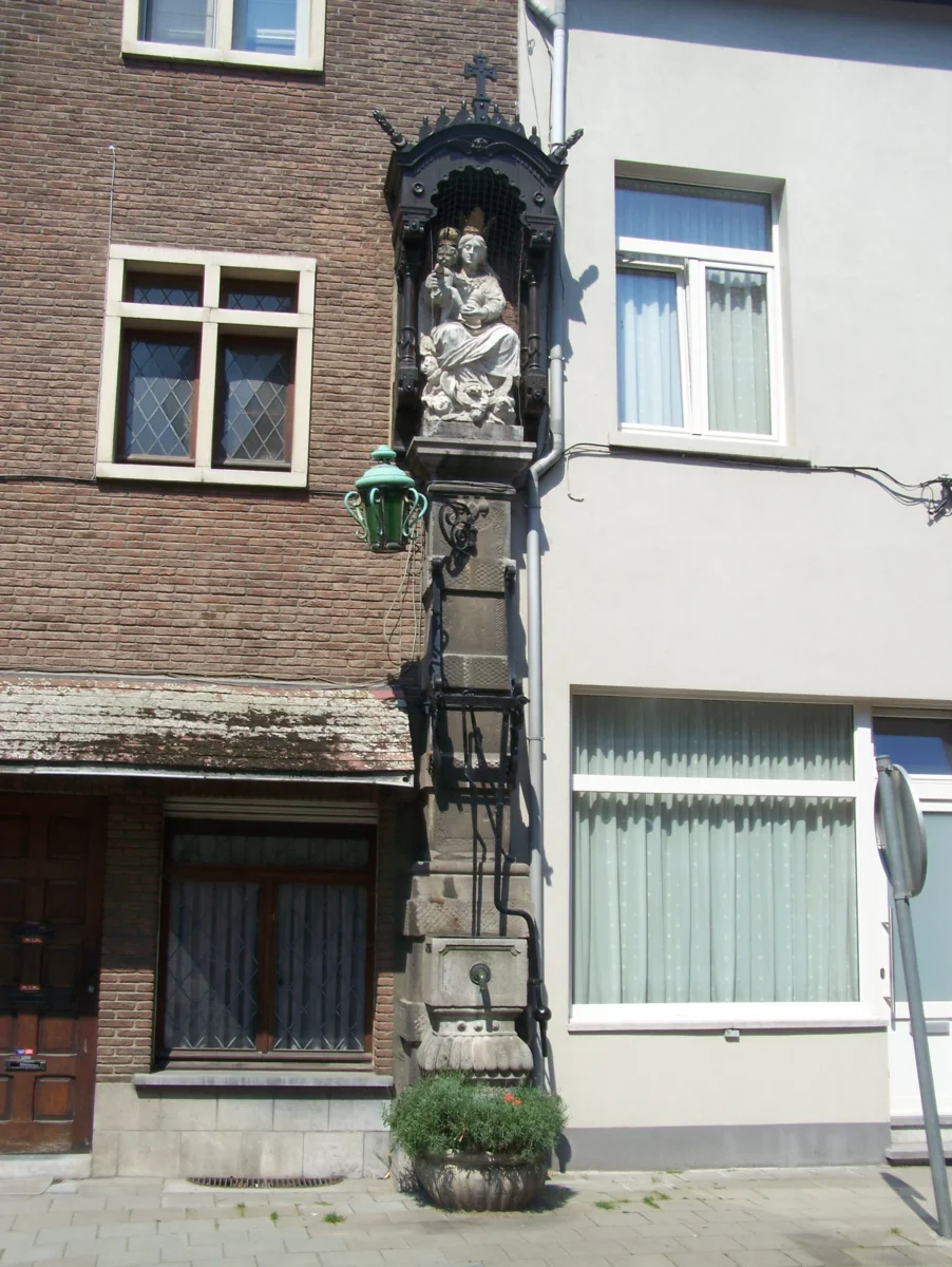 La pompe en pierre bleue de la rue du Roi Albert a une hauteur de plus de 6 mètres et est surmontée d’une niche abritant la statue de la Vierge assise avec un enfant dans les bras. Tous les deux sont couronnés. Elle fut fabriquée par Cornelius van Everbroeck en 1720. La poignée de la pompe est en fonte. Un croissant de lune, un serpent et des têtes d’anges sont placés aux pieds de la statue.