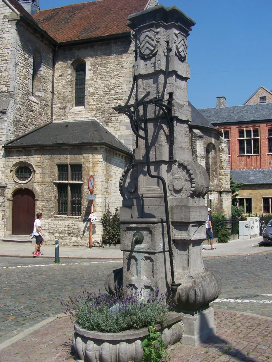 Cette pompe désaffectée est conçue dans l’esprit d’un baroque assez tardif et se présente sous la forme d’un pilier avec application de pilastres à panneaux que coupent des bossages. Un soubassement élargi à godrons et volutes garnies de perles, largement traité, lui procure une assise qui la rattache bien au sol.