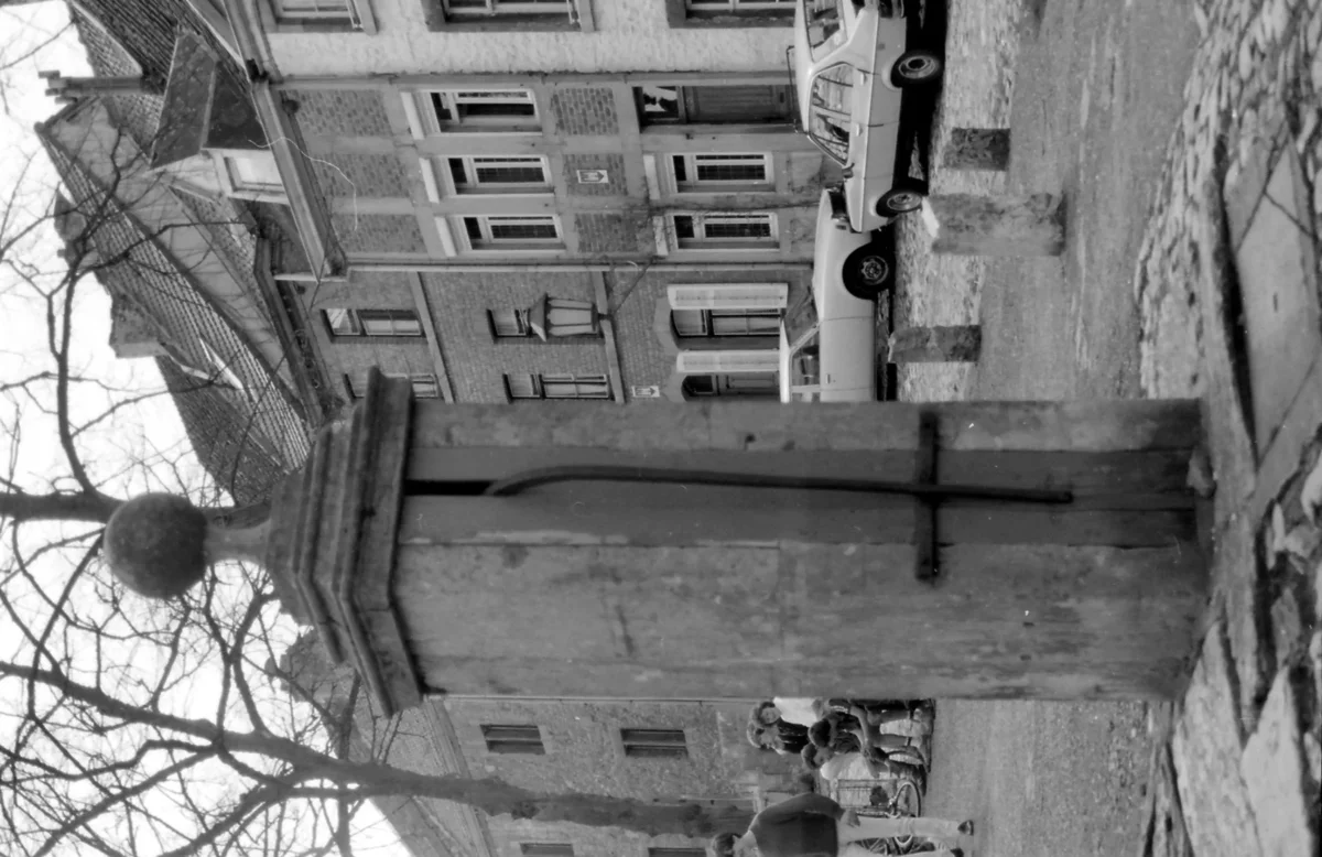 Moins majestueuse que la fontaine ou pompe de la Vierge située à quelques mètres, cette pompe est affinée par une petite sphère délicatement montée. Une inscription sur la corniche de la face antérieure date la pompe :