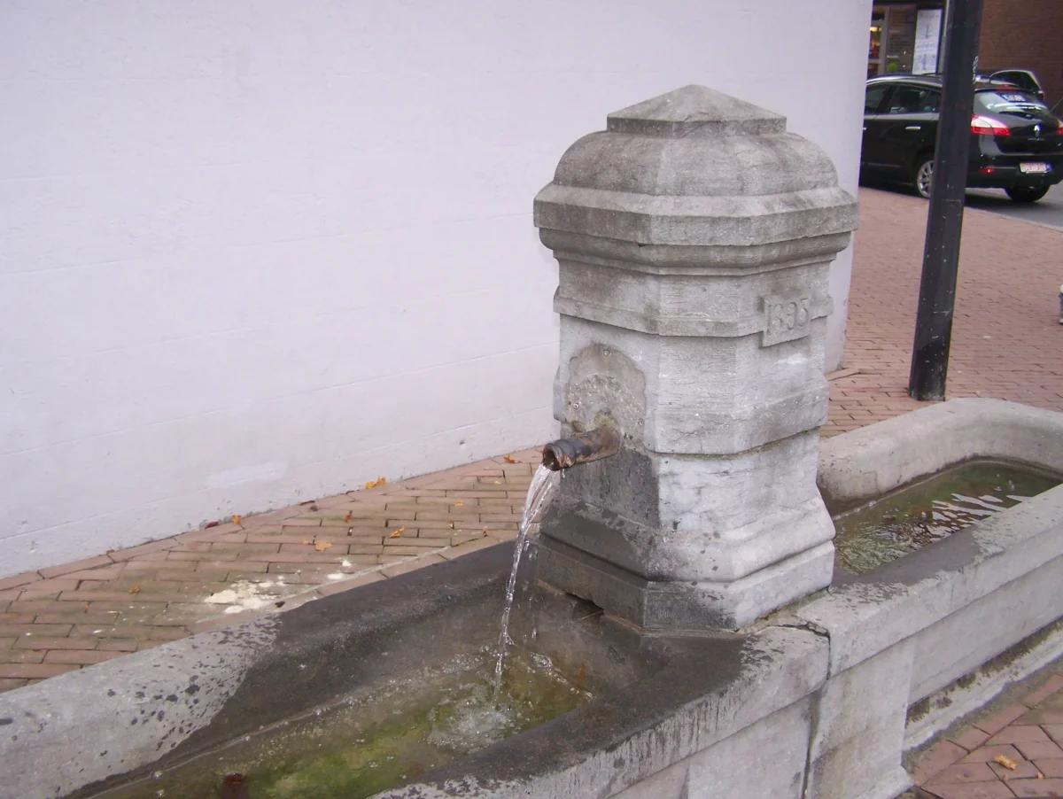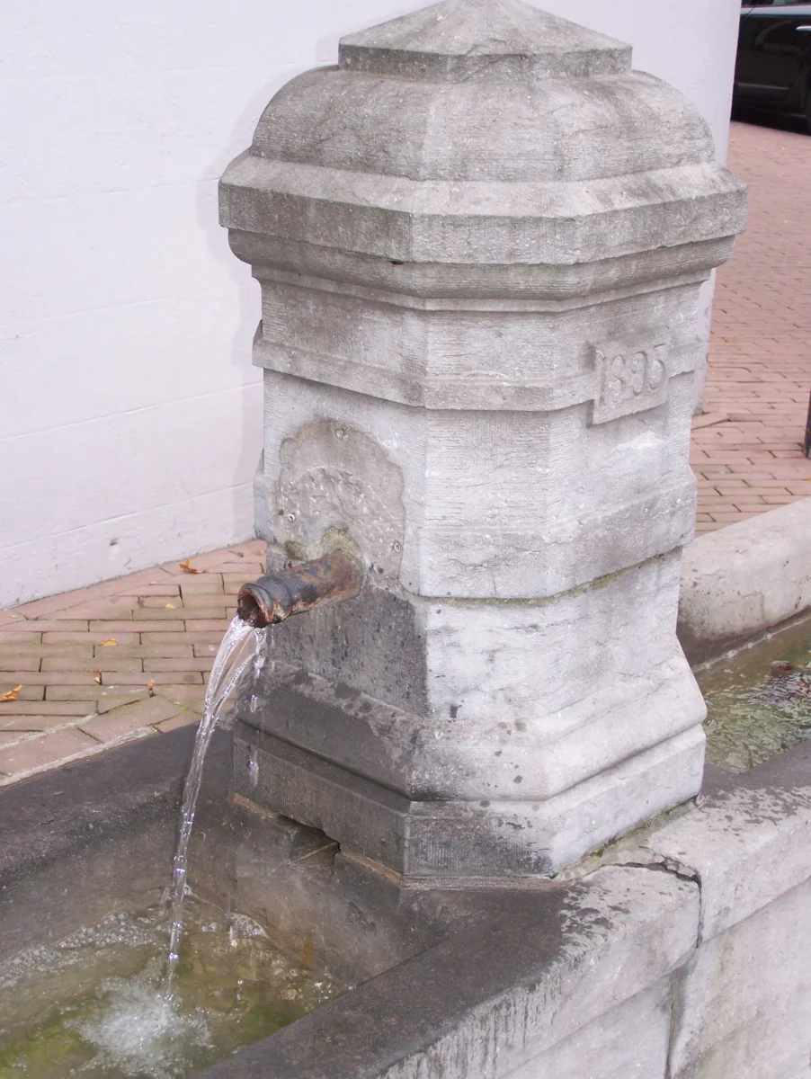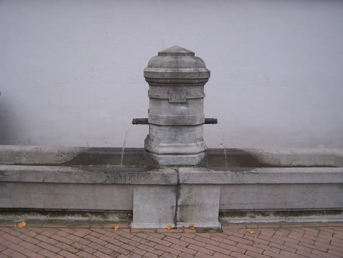 Á l’angle de deux rues, la petite fontaine alimente des bassins opposés. Le fût octogonal est scandé d’anneaux. Une calotte coiffe le tout. La répartition symétrique des bacs en pierre de taille lui confère une élégance malheureusement amoindrie par son cadre. La date millésime de 1895 est gravée sur l’une des faces du fût.