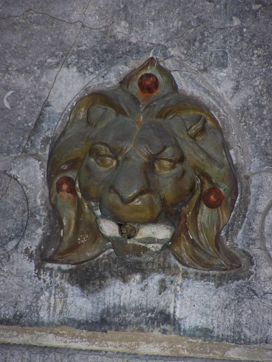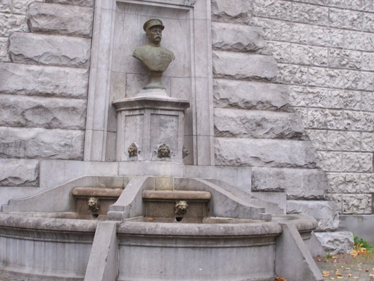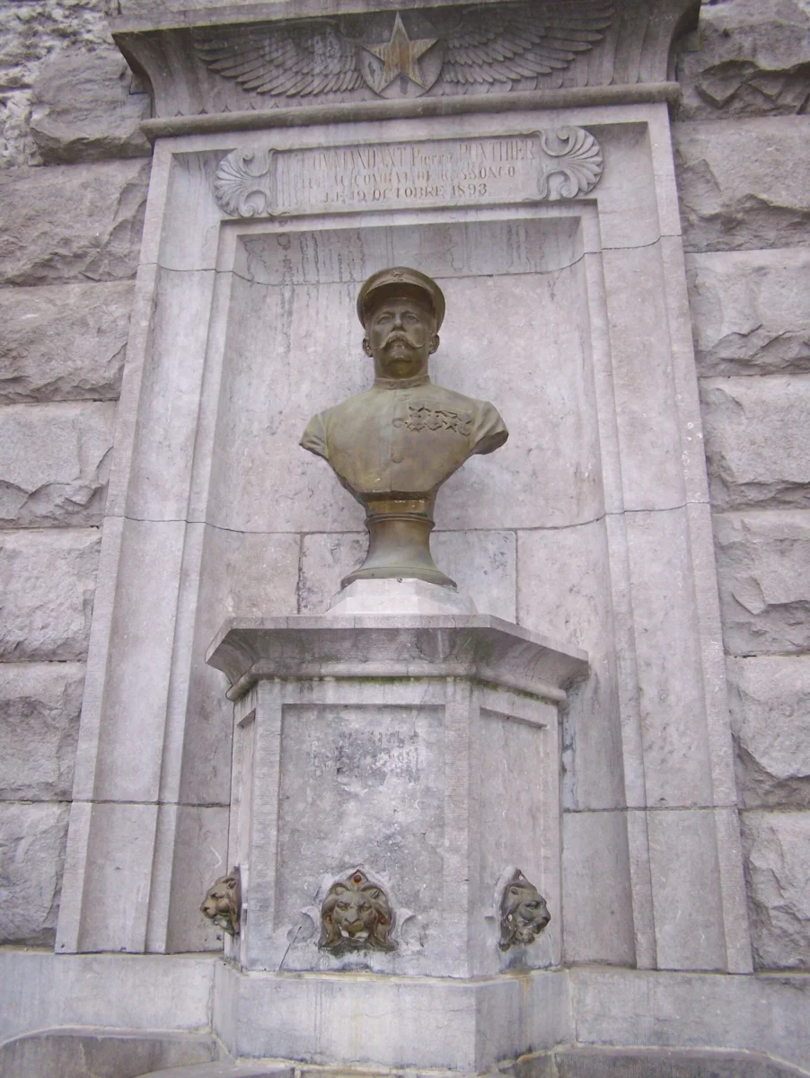 Cette fontaine commémorative s’inspire de l’ancienne Égypte. Érigée à sa mémoire, le buste du commandant Pierre Ponthier, tué au combat de Kassongo (Zaïre) en 1893, est posé sur un socle entouré d’une porte de temple égyptisant. Un bossage irrégulier évoque une pyramide. Seuls les bassins semi-circulaires en cascade sortent du plan mural. Trois lions cracheurs distribuent leur eau dans les différentes parties de la fontaine.