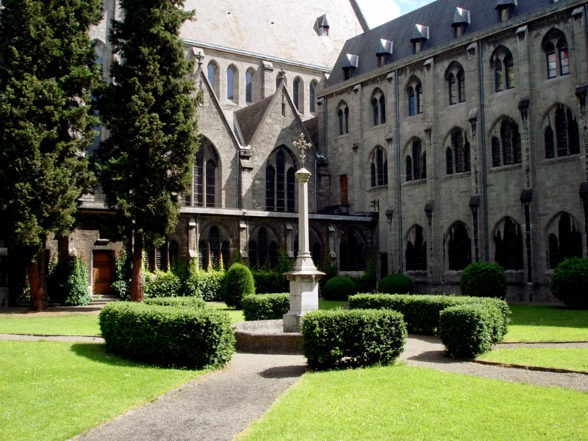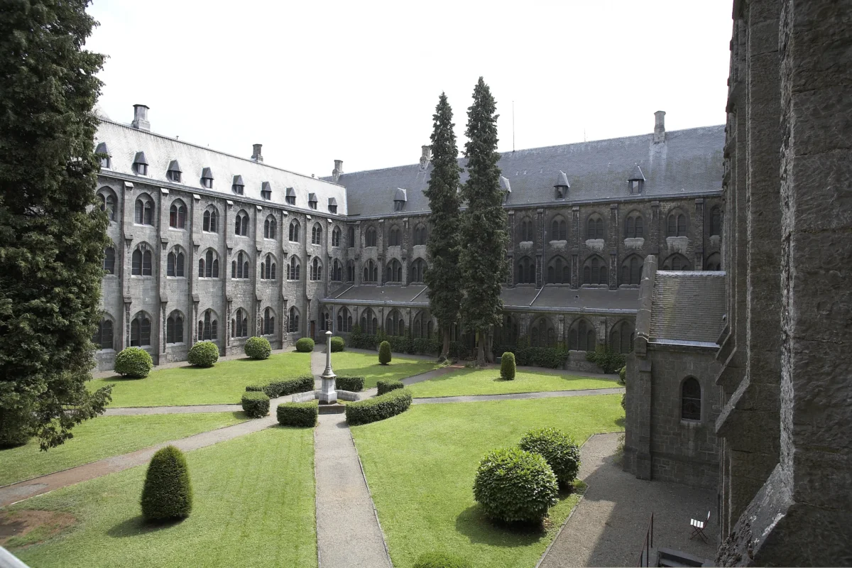 Au centre du préau de l’abbaye de Maredsous, c’est-à-dire au cœur du jardin intérieur, qu’entourent les quatre ailes des bâtiments claustraux se trouve une fontaine. L’architecte de l’abbaye, Jean-Baptiste Bethune a ainsi voulu reproduire le plan de l’abbaye médiévale de Villers-la-Ville. Le préau, selon la symbolique médiéval, représente le jardin d’Eden, le paradis terrestre, tel qu’il est suggéré dans la Bible (Genèse, II, 10-14). Dans ce texte, on peut y lire que ce paradis était arrosé par quatre fleuves qui ne tarissent jamais et qui assurent une végétation toujours verte. La fontaine du préau, qui fait couler l’eau par quatre becs représentant les quatre fleuves, est censée maintenir une végétation toujours verte et de fait le préau actuel ne contient que des arbustes verts (buis, lauriers etc). L’eau qui coule dans la vasque provient d’une source en amont de l’abbaye et qui alimente en eau tout le complexe abbatial.