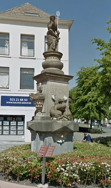 Le socle central, massif, cubique, supporte, par l’intermédiaire d’une sorte de chapiteau renversé, une statue de Neptune dont la facture est assez fruste, quoique vigoureuse.