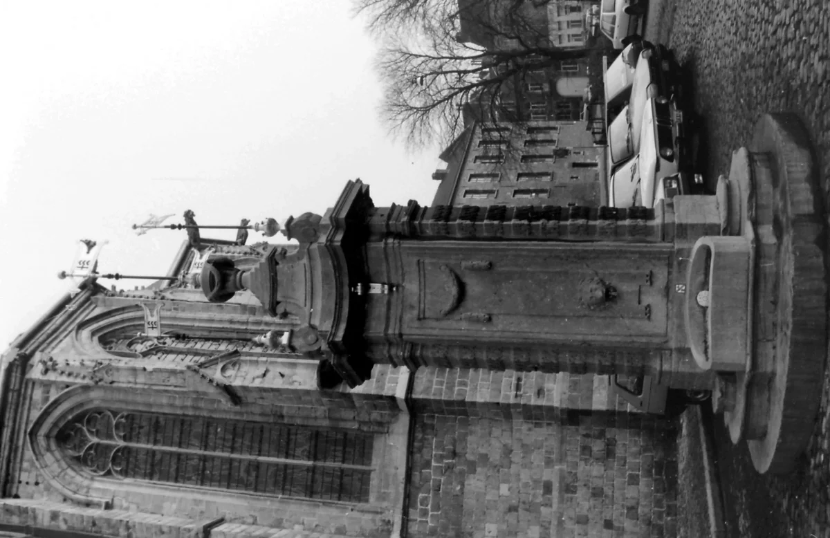 Son revêtement est en pierre d’Écaussinnes et offre une forme triangulaire de style Louis XVI sculptée de gracieux pilastres coupés de cristallisations et dont l’extrémité se termine en forme de pyramide avec console et vase bannière.