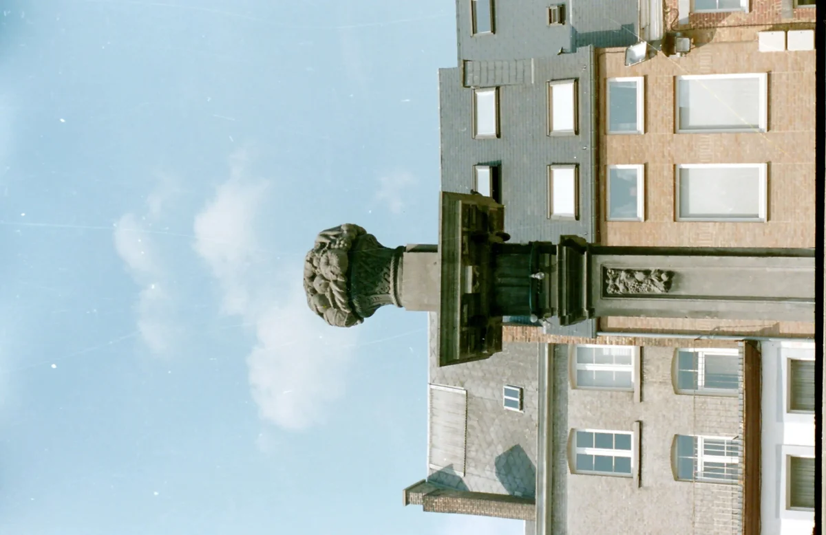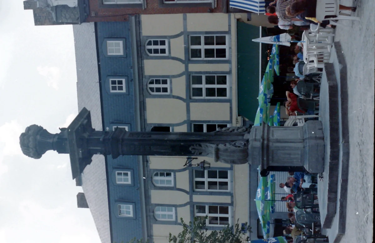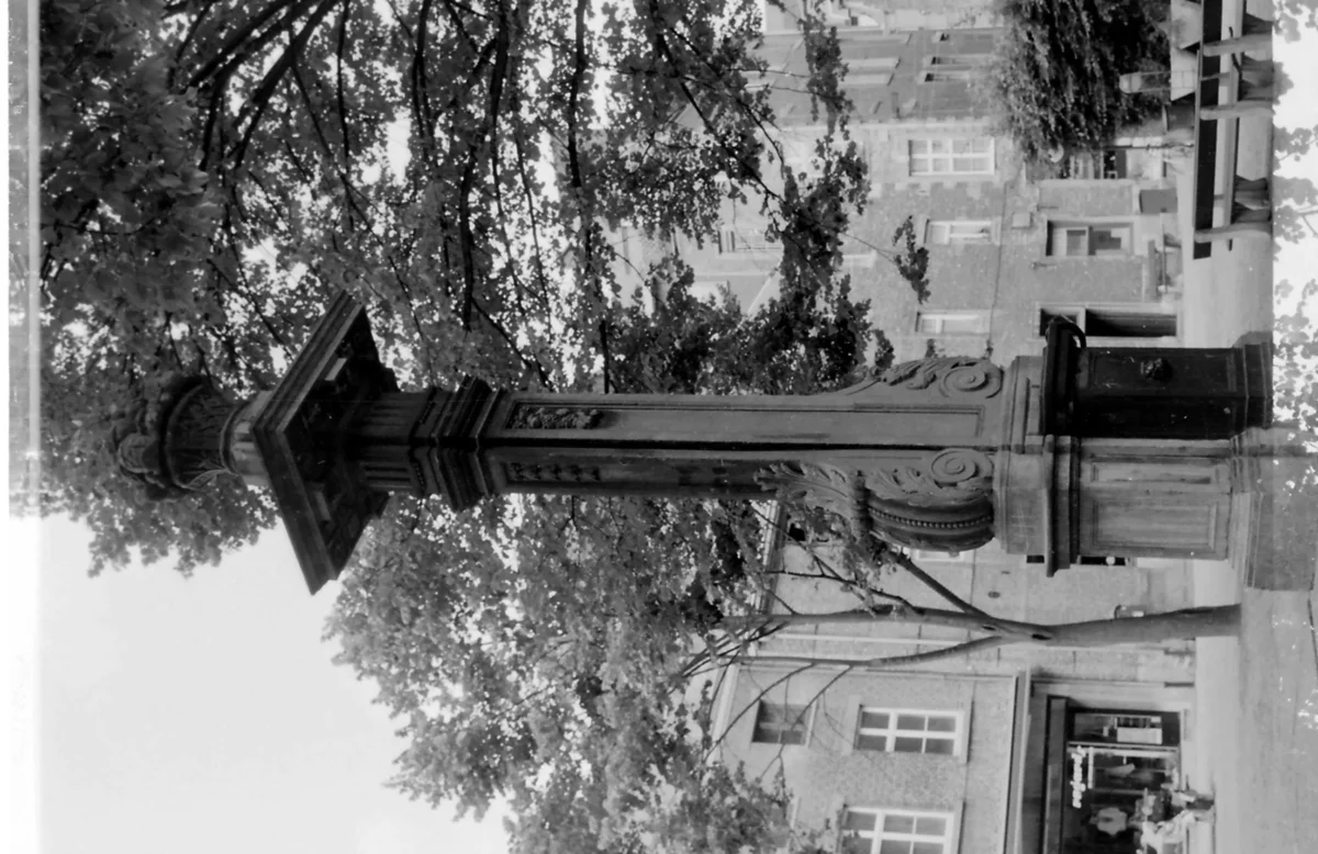 Le pilier est recouvert d’une large tablette sur laquelle on a posé une corbeille de fruits et de légumes, symbole du marché qui étale encore à ses pieds aujourd’hui ses richesses.