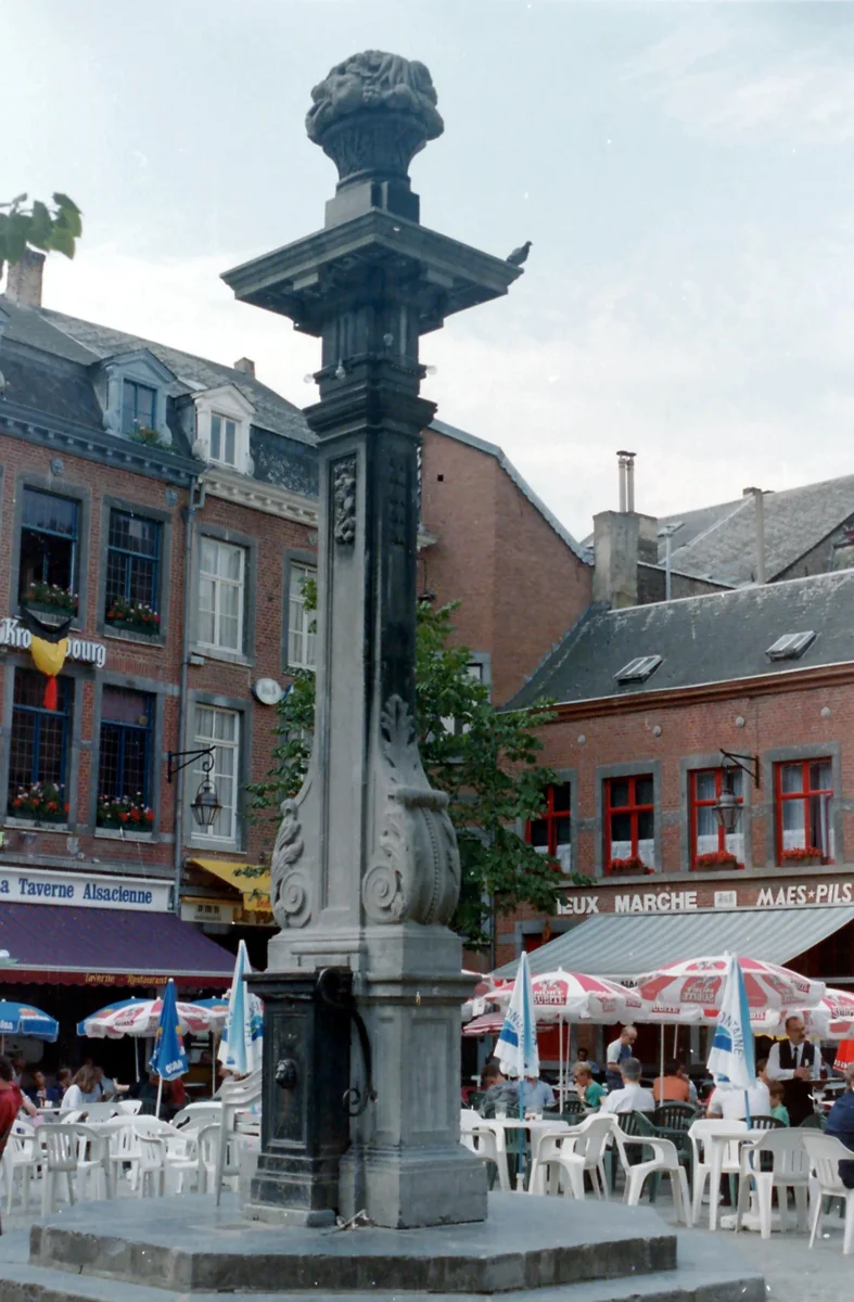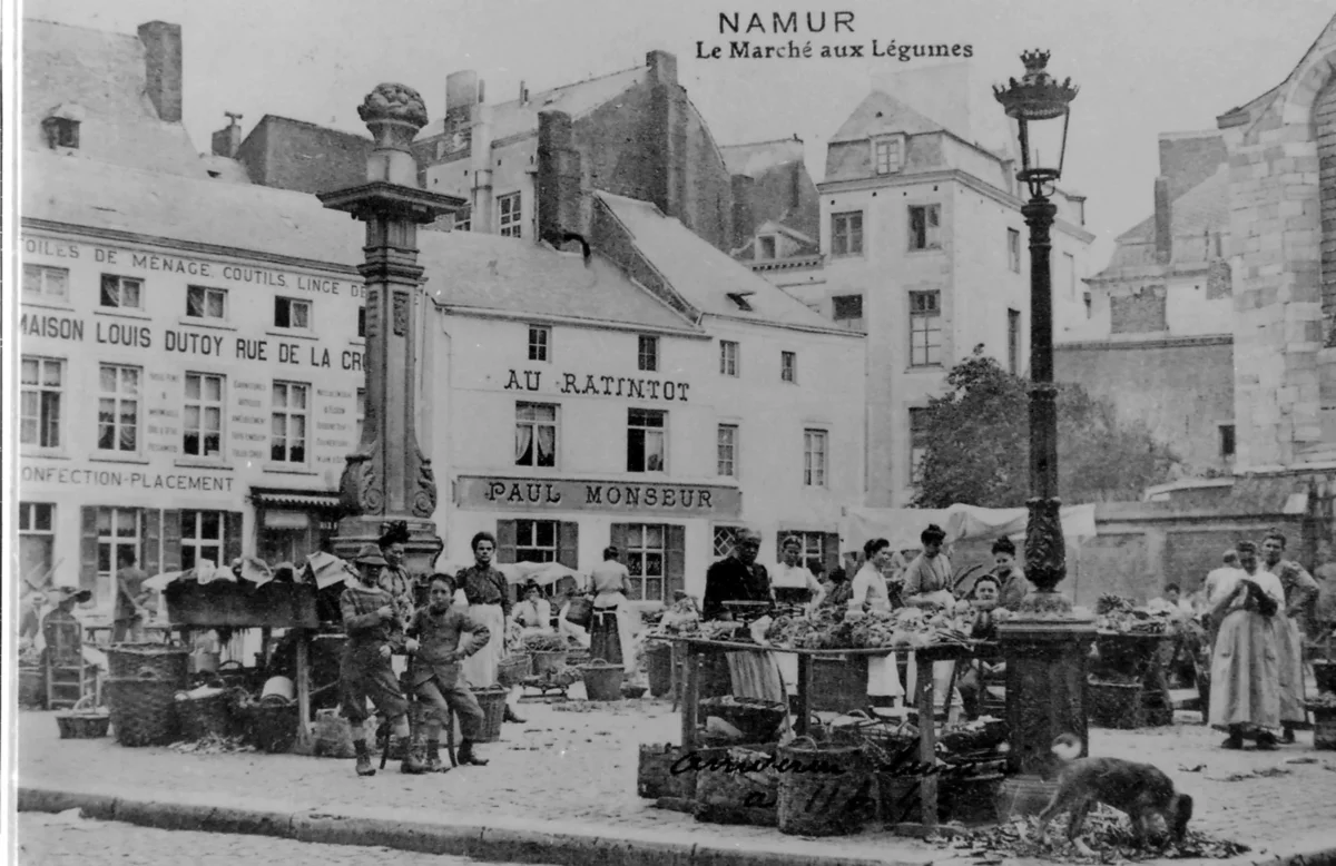Élégante pompe en calcaire élevée en 1778 sur la place du Marché-aux-Légumes lorsque le magistrat de la ville de Namur fit quelques aménagements urbains. Il détruisit l’ancienne église Saint-Loup de Namur qui jouxtait celle de Saint-Jean et créa ainsi le marché-aux-légumes actuel. La pompe monumentale consiste en un pilier carré à chapiteau toscan, orné de panneaux ainsi que de palmettes et renforcé à la base par de grosses volutes.