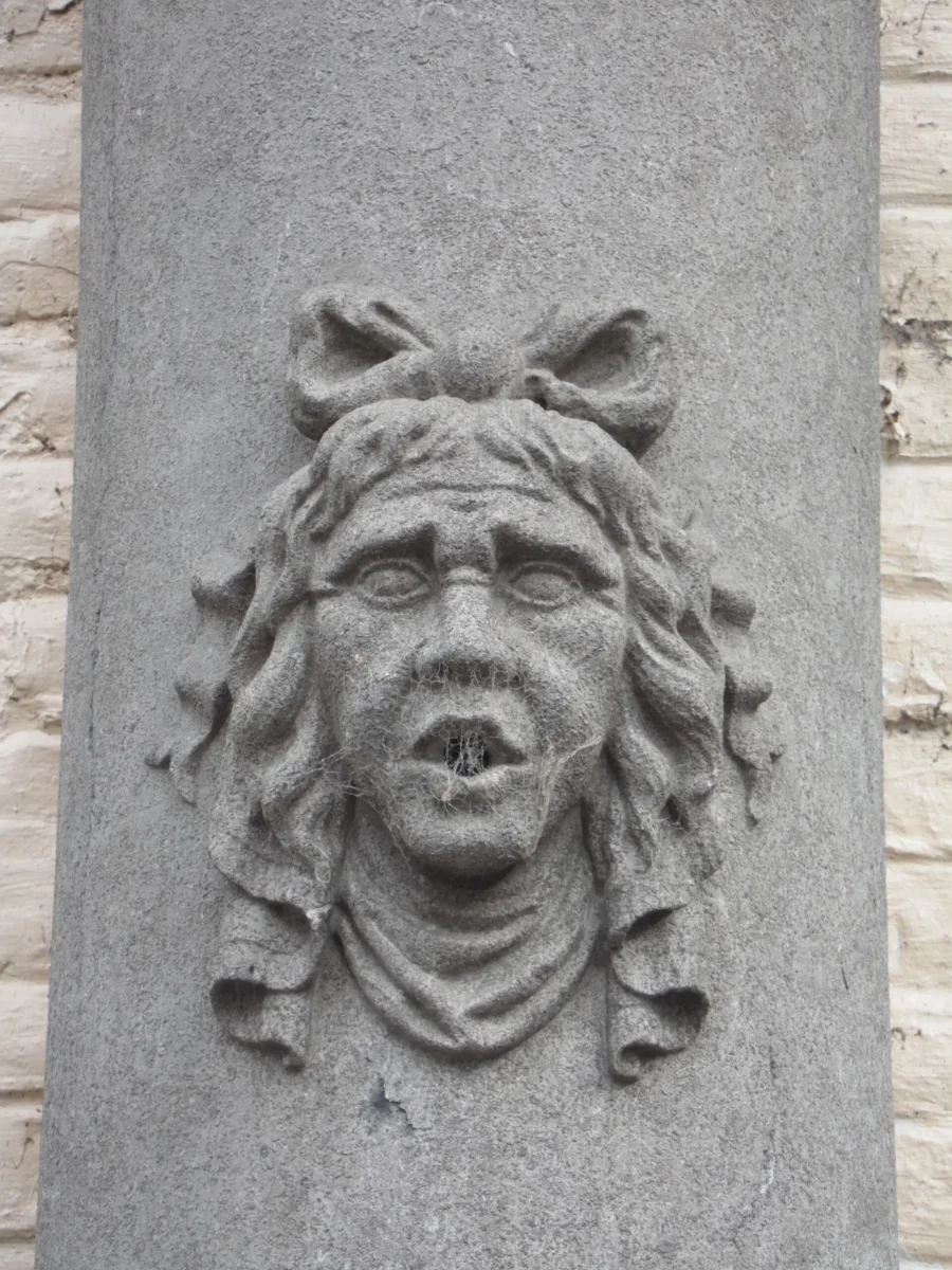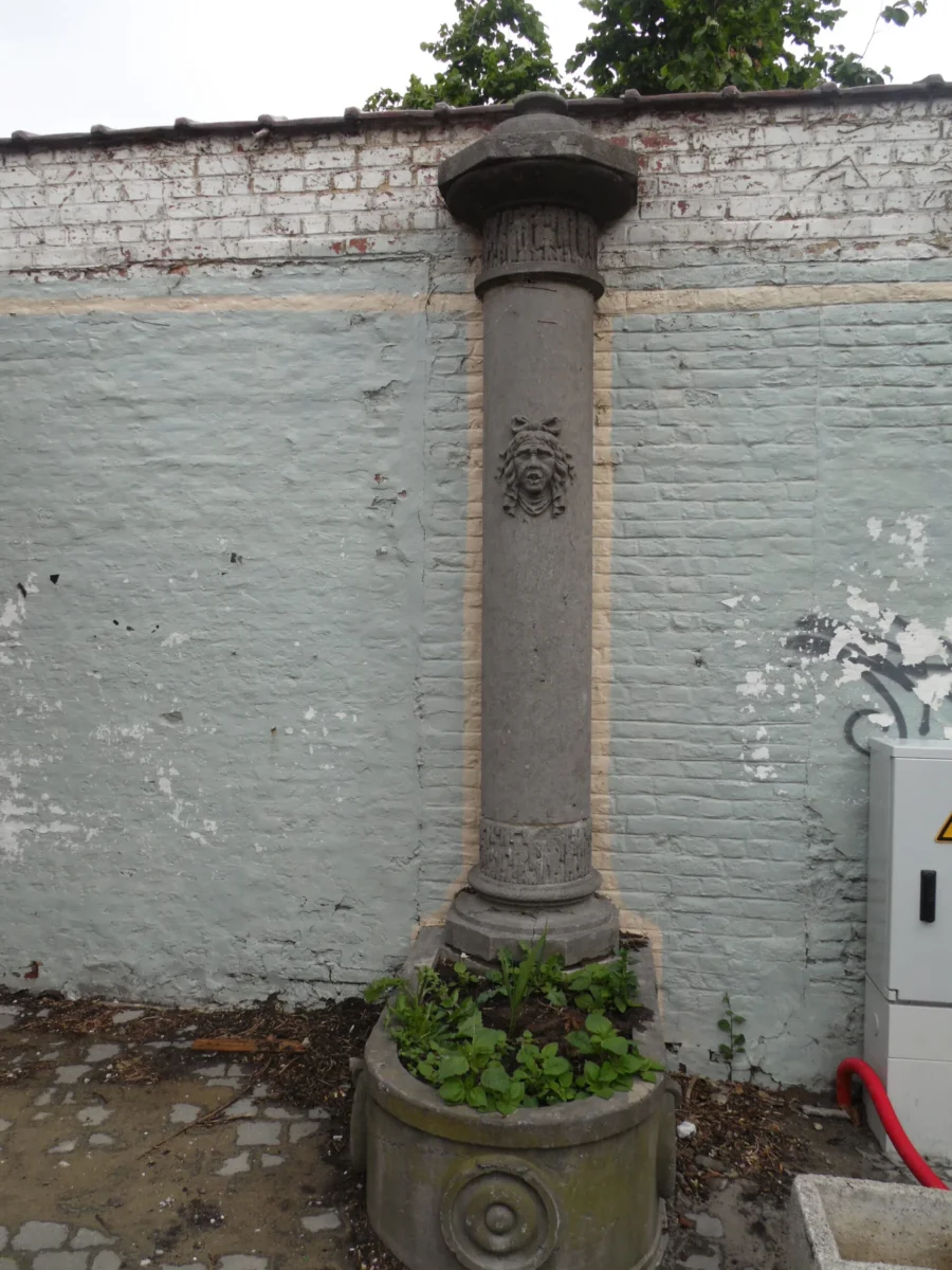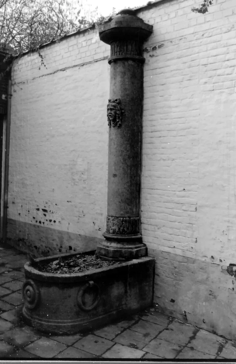 Cette fontaine se compose d’une vasque allongée et une colonne munie d’un cracheur d’eau à forme de visage humain. L’ornement sommital de la colonne a disparu. Le style de cette fontaine fait la transition entre le style Louis XIV et le style Empire. Elle date probablement du début de la fin du 18ème siècle-début 19ème siècle. Elle se trouvait à l’origine dans la rue du Béguinage mais fut transférée en 1955 dans la cour du Musée Communale et enfin à sa place actuelle.