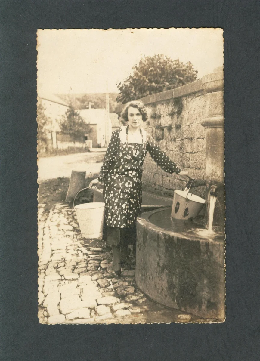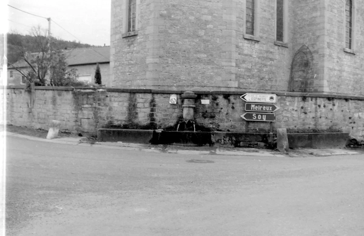 Adossé au mur d’enceinte de l’église, un pilier alimente de ses deux poissons cracheurs en fonte un bassin semi-annulaire. Le trop plein se déverse de part et d’autre dans des bacs latéraux en pierre.