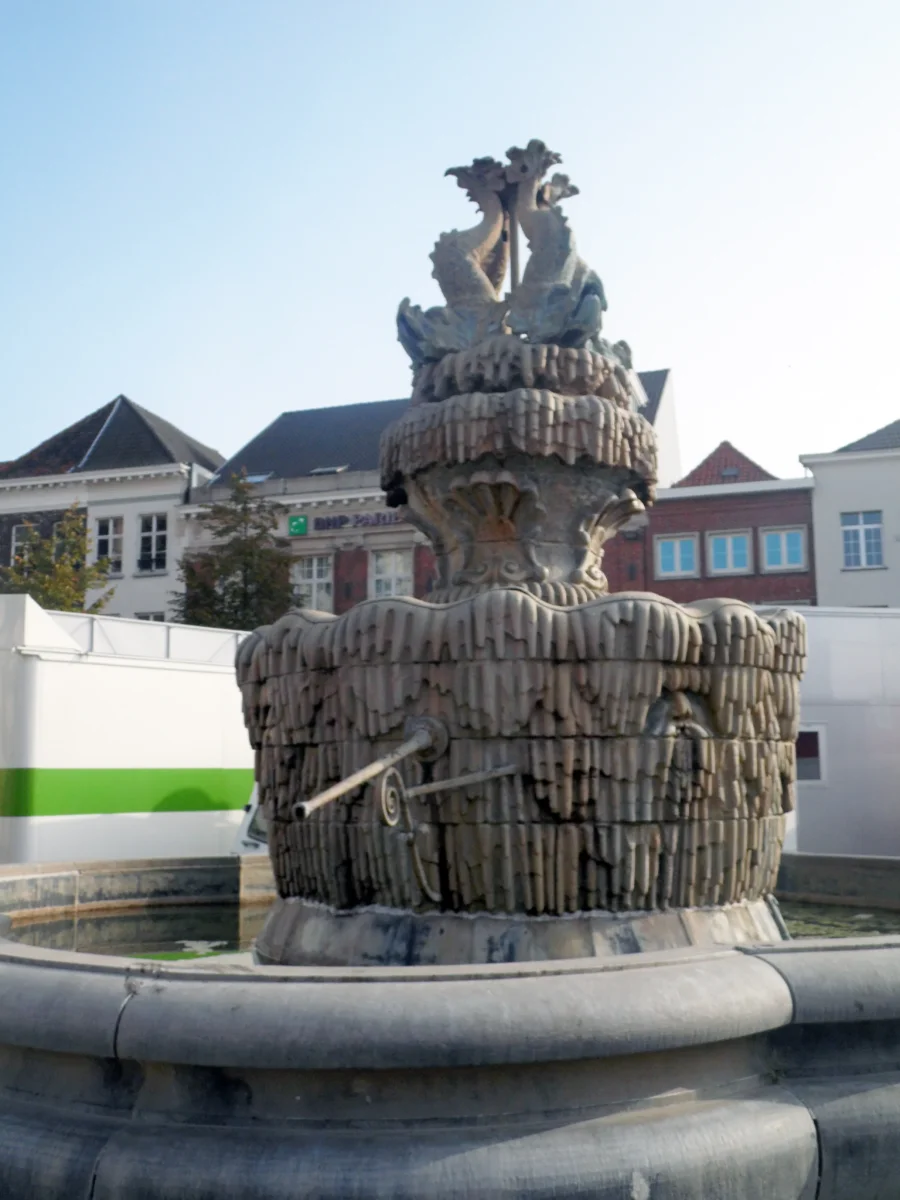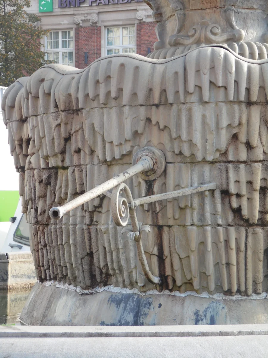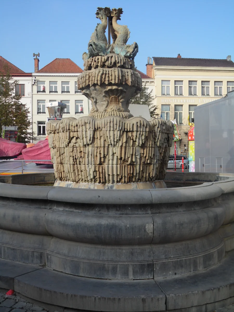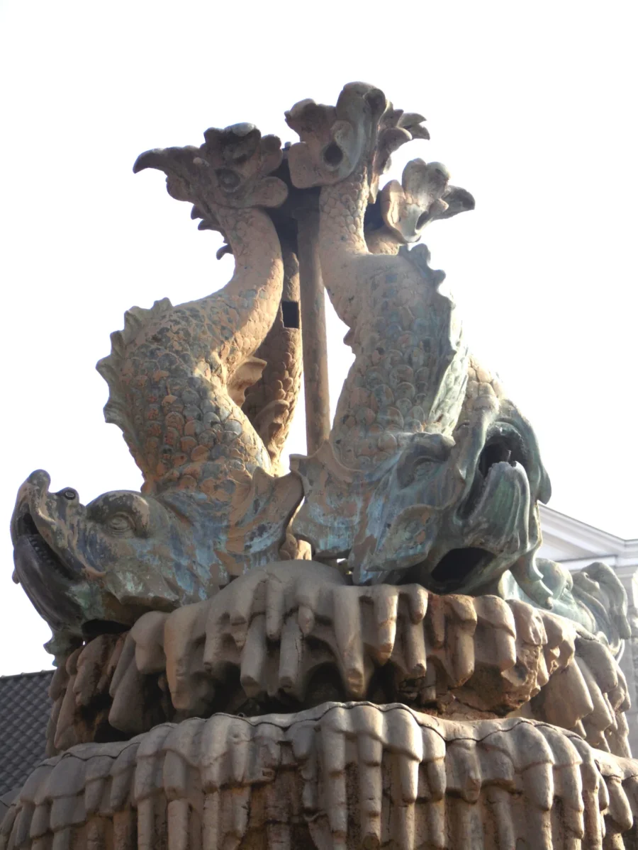 A l’origine (1676), la fontaine était surmontée d’une fleur de lys. En 1679, celle-ci fut remplacée par un lion de cuivre doré et en 1712, par un triton doré.