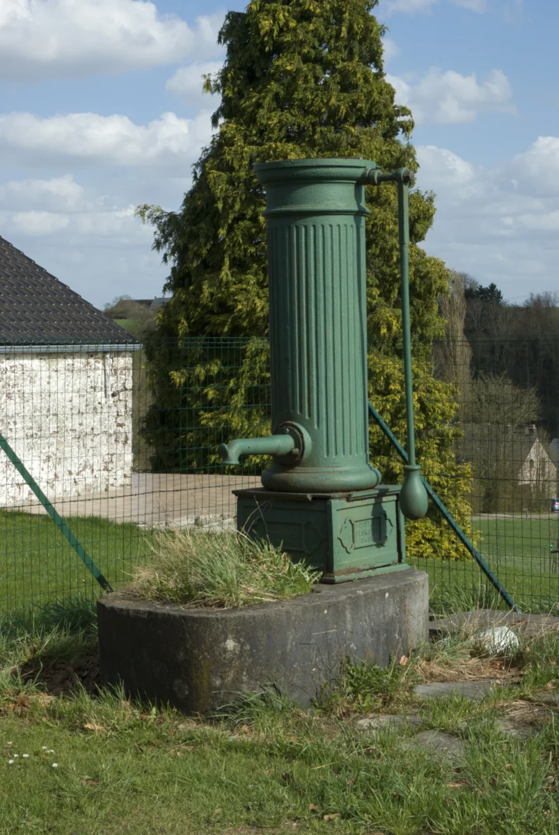 Il s’agit d’une pompe en fonte sur socle en pierre bleue avec bac, située à 100 m de la rue du Puits. Le couronnement a disparu.