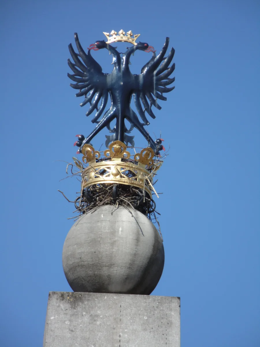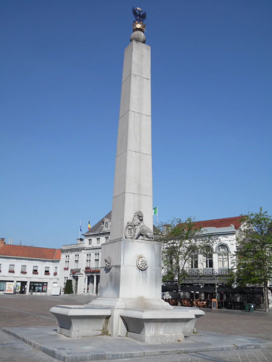 Monument impressionnant en pierre bleue avec une obélisque de 11 mètres de haut sur une haute base carrée, quatre bassins adjacents et un globe terrestre couronnant jusqu’en 1830 Depuis 1924, ce sont les armoiries de la ville, couronne dorée et aigle à deux têtes qui surmonte l’obélisque. Deux lions héraldiques sur la base des côtés Est et Ouest entourent le blason de la ville, des médaillons à tête d’homme barbu entourent les jets d’eau.
