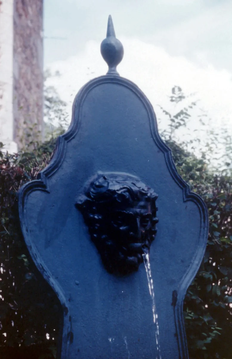 Un bassin hexagonal étiré précède une tête verticale. Des rosaces et un satyre la décore. Le pommeau à pointe permet de se retenir lorsque l’on se penche vers le jet. L’eau s’écoule par la bouche d’une tête dionysiaque.