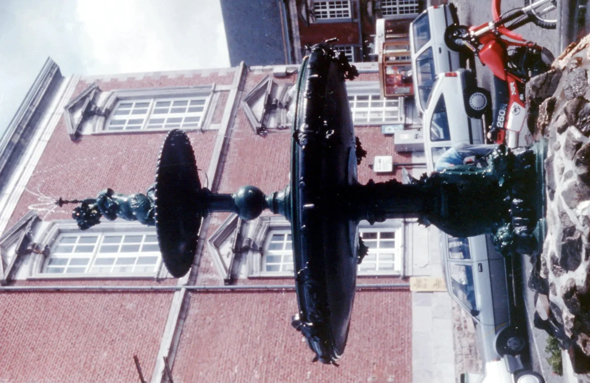 Posée sur un amas de pierres, installée dans un bassin circulaire, la fontaine est située près de la basilique de Saint-Hubert daterait de 1858. L’eau, qu’une pompe amène du bassin circulaire au sommet, débouche d’un tube que tient un petit génie installé au sommet de la construction – il semblerait, d’après d’anciens documents que le génie tenait un dauphin dans ses bras, ce qui expliquerait ce bout de tuyau disgracieux – pour retomber dans une première vasque, dans laquelle on a pratiqué des encoches taillées dans la bordure, et ensuite dans une deuxième vasque d’où, par des orifices latéraux, elle parvient dans le large bassin de béton.