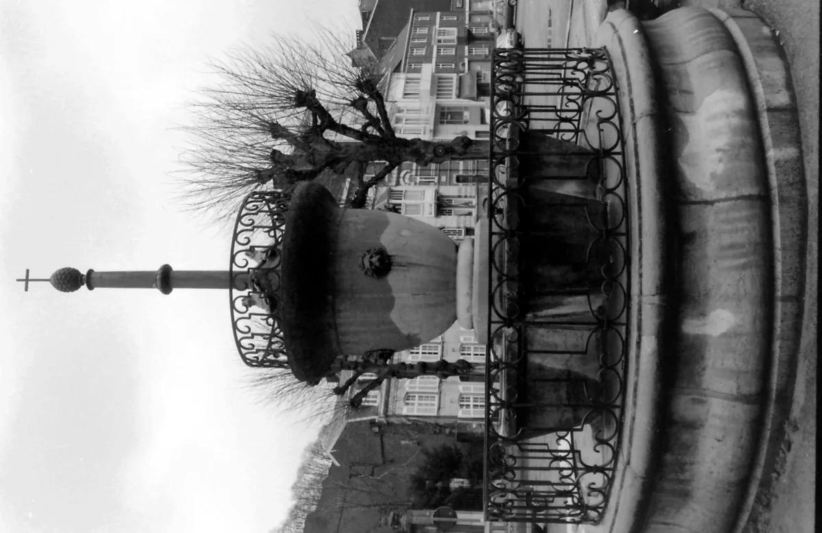 Un haut soubassement circulaire galbé forme le socle de la fontaine. La grille en fer forgé entoure quatre bassins rectangulaires disposés en croix. Un imposant cratère en pierre et ses quatre têtes de lion les pourvoient en eau. Point culminant, le perron en fonte et sa pomme de pin sont entourés de trois grenouilles.