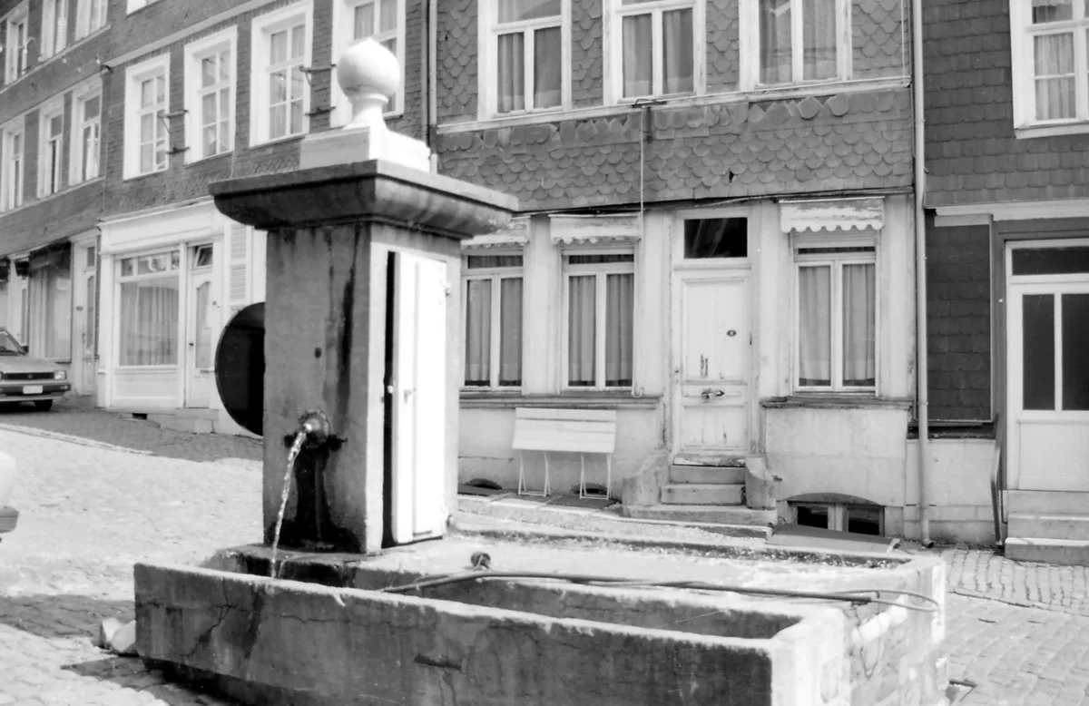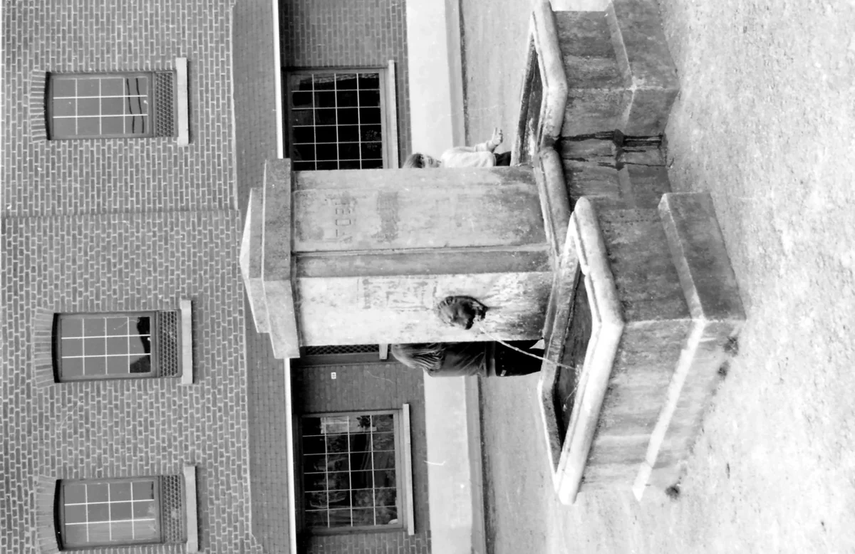 À l’arrière de deux bassins rectangulaires, se dresse un pilier de section carrée. Entre les deux bacs, une magnifique dalle de schiste est posée. La face antérieur du pilier a conservé la belle porte d’origine. Le couronnement mouluré déborde largement et sert de support à l’amortissement octaédrique.