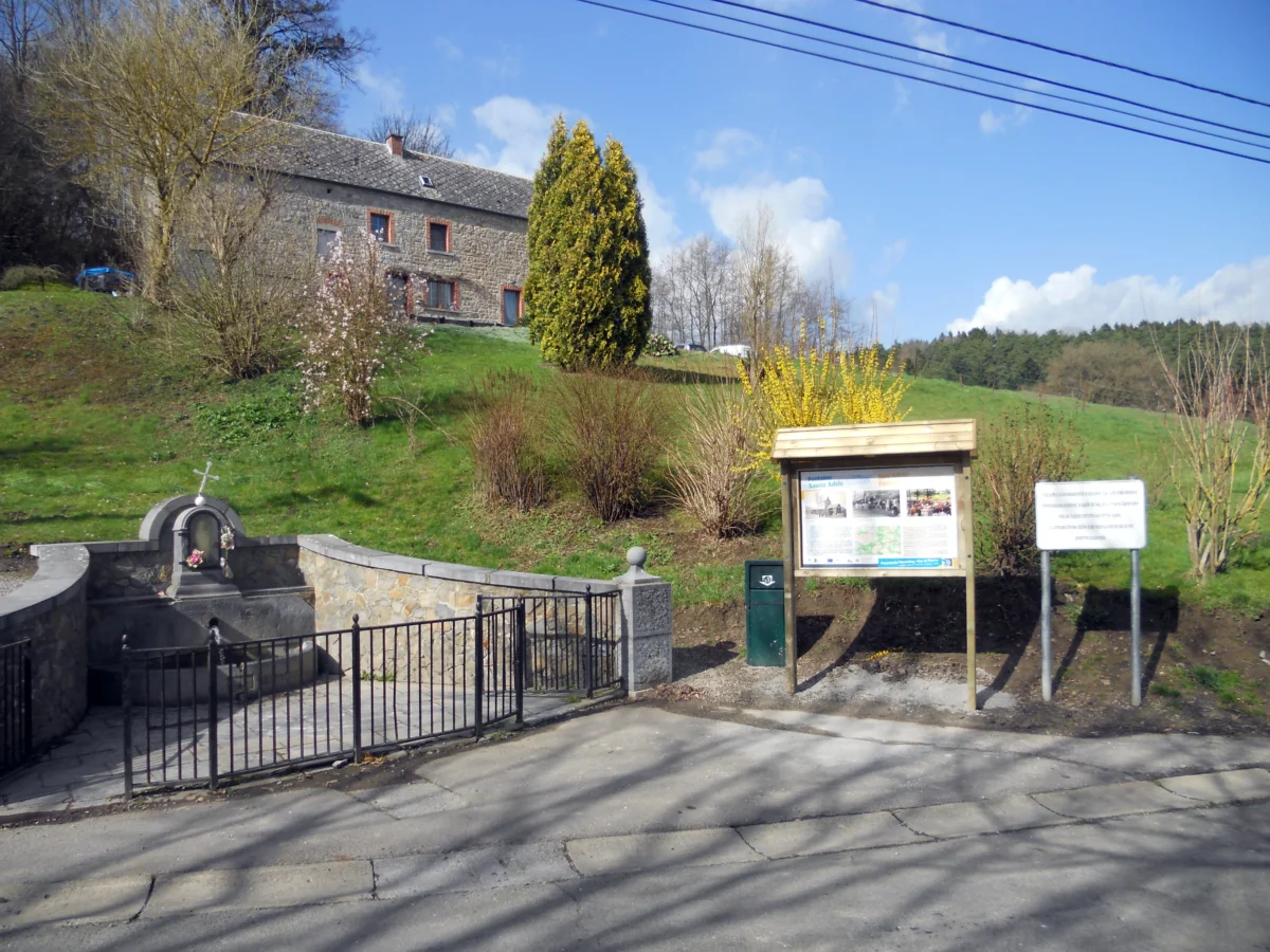 Cette fontaine est dédiée à Sainte-Adèle, cette dernière était la fille d’un puissant dirigeant du 6ème siècle, proche du pouvoir des rois mérovingiens. On raconte que Sainte-Adèle, née aveugle, aurait recouvré la vue le jour de son baptême. Très pieuse, Adèle fonda l’abbaye d’Orp le Grand. Cette abbaye devint noberline à la fin du Moyen-Age.