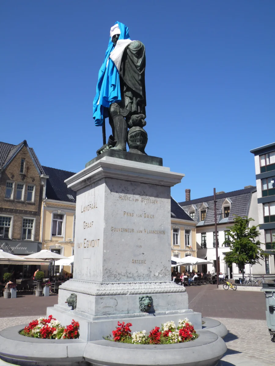 Au centre de la place du Marché de Zottegem, on trouve sans grande surprise une statue de Lamoral, comte d’Egmont. Il s’agit en effet de la ville où on peut encore trouver son château. Décapité le 5 juin 1568, le comte d’Egmont fut inhumé à Zottegem dans la crypte familiale. Lors de certaines occasions, la statue est drapée de tissus blanc et bleu.